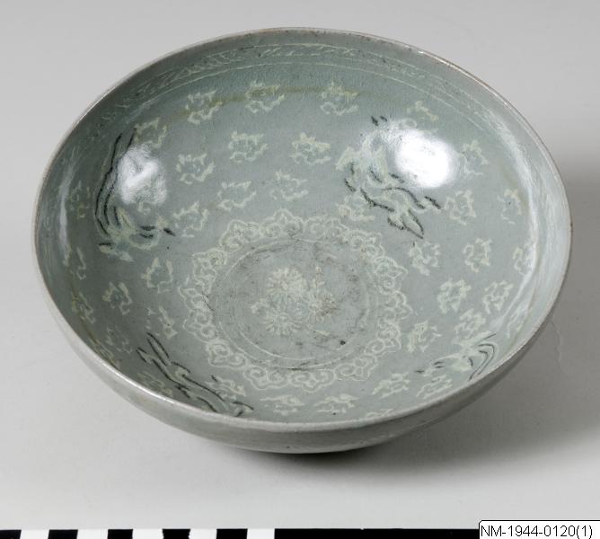 Skålen är tillverkad under sena Goryeo, då inlagd dekor på celadongods blivit myllrande och stämplar hade börjat användas för att upprepa mönster. Under sena Goryeo ändras också glasyrens färg från att ha varit av en mer blågrön, jadelik ton, till att blir mer gröngrå.