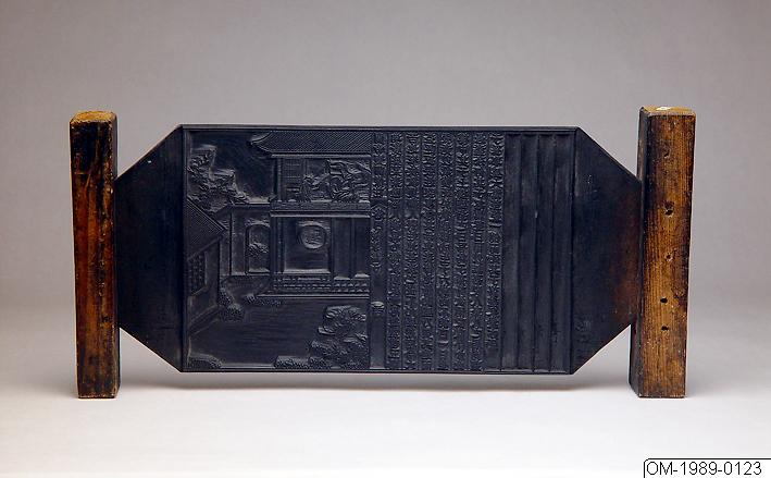 Det här tryckblocket i trä är utskuret på båda sidor med text och illustrationer till tryckning av boken Illustrerad och kommenterad utgåva av kejsare Guans dyrbara förmaningstal, vol. 4, sidorna 23 och 24. I mitten är bokens titel utskuren, liksom volym och den episod som illustreras, samt sidnummer (關帝 寶訓 像註 四卷 悭吝被火 二十三 ; 關帝 寶訓 像註 四卷 寃家爲子 二十四). Med blocket kunde man trycka två sidor av boken, var och en indelade i två spalter som avskiljs från varandra av en marginal. Texten står på sidans högra del, och är strukturerad i maximalt 11 kolumner med 22 kinesiska tecken i varje. På den vänstra delen finns illustrationen av den scen ur kejsare Guans liv som beskrivs i texten. Runt den utskurna delen av tryckblocket går två utskurna linjer som bildar en ram runt både texten och illustrationerna i den tryckta boken. Två trähandtag sitter på varsin sida om tryckblocket. På utsidan av handtagen finns utskurna röda tecken: Förmaningstal vol. 4, sida 23, sida 24. (寶訓 四卷 二十三 二十四). Tryckblockets yta är svart av tusch.