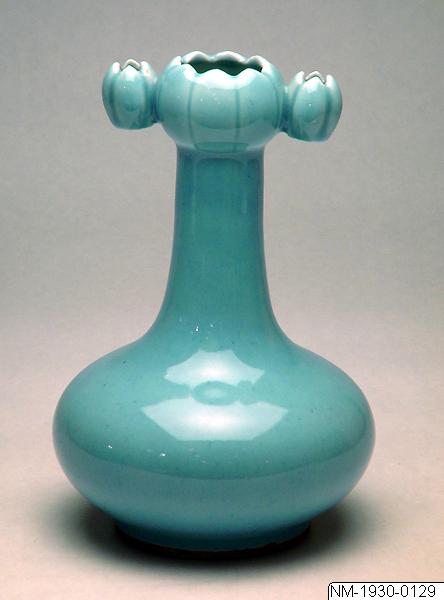 Vas av porslin glaserat i ljusblått. På undersidan ett sigillmärke i underglasyrblått. Från träskåp K i porslinsrummet.