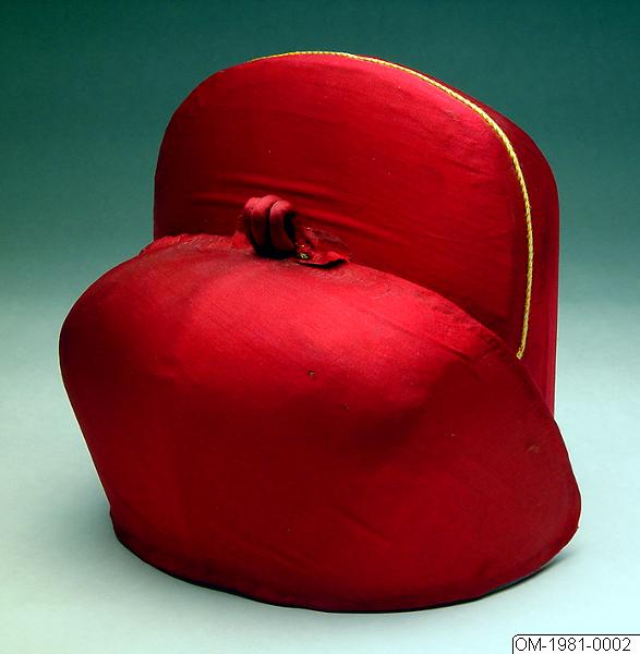- Huvudbonad, satin och papp, Kina. 1900- tal.
