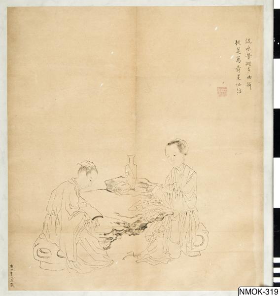 Motiv: Två unga damer, av vilken den ena spelar på ett ch´in-instrument och den andra sitter lyssnande.