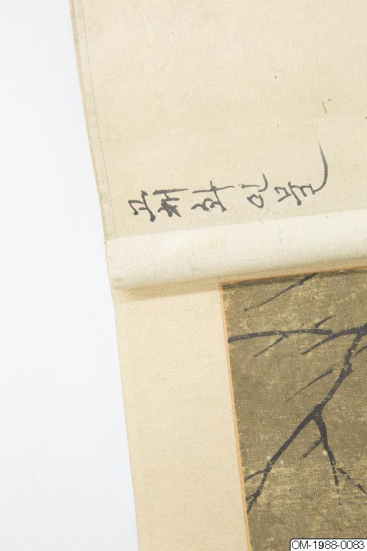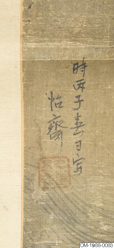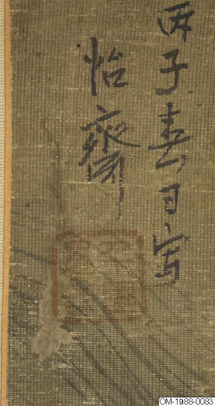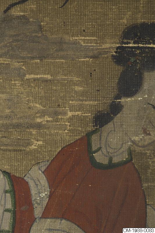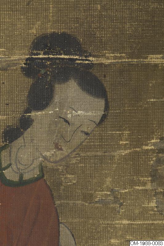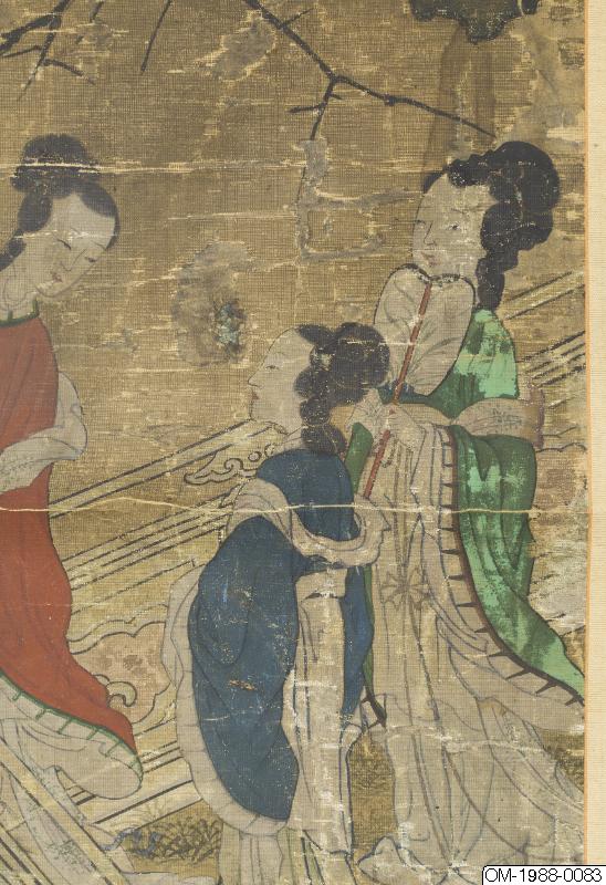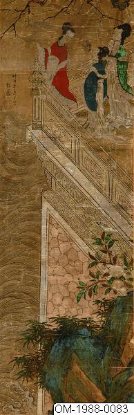 Den här tavlan föreställer tre kvinnor på en hög balkong med ett skulpterat räcke i vit sten. Kvinnorna är klädda i kinesisk stil, en kvinna har en solfjäder (mieson på koreanska) och alla ser ut att ha hårdekorationer. Kvinnan som är klädd i rött pekar på någonting bortom balkongen och vänder huvudet mot de andra två, som verkar lyssna uppmärksamt. De nakna grenarna i trädet ovanför kvinnorna kontrasterar mot de grönskande växterna på den grönblåa klippan i förgrunden. På klippan syns en gren med gröna löv och mogna persikor samt bambugrenar. Persika och bambu symboliserar långt liv och odödlighet. Under balkongen syns vattnets vågor och virvlar. Figurerna i bilden är målade i den noggranna stilen (gongpil på koreanska). Färgerna är hållna i "den blågröna" stilen. Perspektivmålning har används i återgivandet av de arkitektoniska elementen i bilden. En inskrift på vänster sida lyder: "målad på våren av året Bingzi [1876?] (時丙子春日寫). Målningen är signerad "Yijae"(怡齋). Ett oläsligt fyrkantigt sigill i relief följer efter signaturen. Färgerna har blekts.