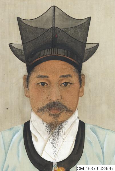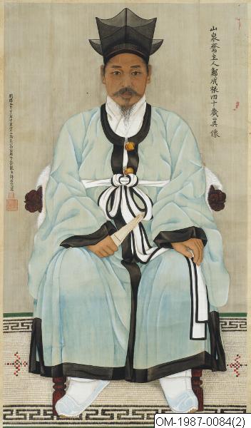 Chae Yong-sin, a military official, showed remarkable talent at painting and was a well-established portrait painter after he painted the portrait of the first King Taejo of the Joseon Dynasty (r. 1335-1408) in 1900 and then one of the 26th King Gojong (r. 1863-1907) in 1901. He was later consecutively appointed governor of Chilgok and Jeongsan. In Jeongsan he made the acquaintance of a well-known patriot called Choi Ik-hyeon (1833-1906) and later became his follower. During this time, and especially from the year 1910 when Korea was annexed by Japan, Chae Yong-sin painted many portraits of Choi Ik-hyeon and his fellow patriots. Chae Yong-sin is renowned for painting realistic portraits by using a technique of highly detail brushwork and strong colours.