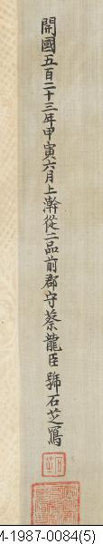 - 山泉齋主人鄭成根四十歲眞像, 開國五百二十三年甲寅六月上澣從二品前郡守蔡龍臣號石芝寫