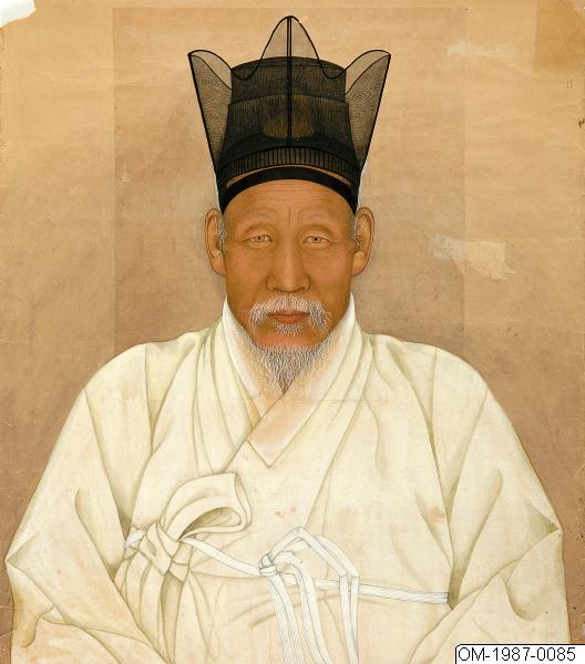 Porträtt av man. Det här porträttet av en lärd man i halvfigur är målat i tusch och färg på papper. Mannen är porträtterad framifrån, klädd i vit rock (durumagi på koreanska) och med en elaborerad huvudbonad. Rocken, som troligtvis är av bomull, har en förstärkt krage (git på koreanska) och knyts över bröstet på höger sida. En separat snodd knuten med en knut mitt på bröstet hjälper till att hålla rocken stängd. Huvudbonaden består av tre delar: ett pannband vars nedre kant syns på mannens panna, en innerhatt (tanggeaon på koreanska) och den yttre hatten som är formad som en krona med tre spetsar (jeongjagwan på koreanska). Den här typen av huvudbonad bars vanligtvis av lärda män inomhus.