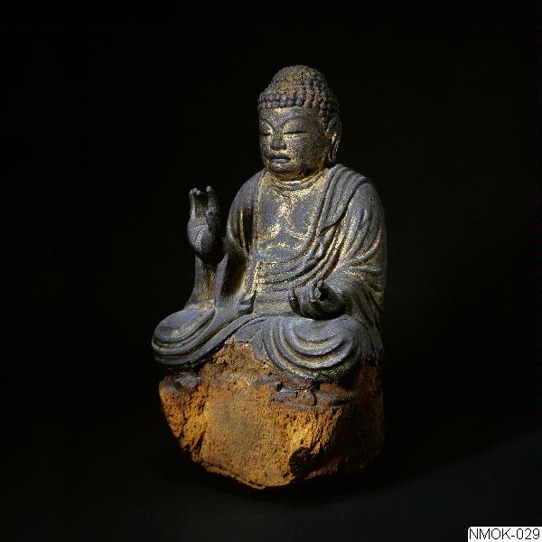 Buddha sittande på en lotussockel med benen hopvikta och täckta av manteln. Högra handen höjd i abhaya mudra, den vänstra handen vilande på knät, så att tummen och de två första fingrarna möts (som om de hållit i ett föremål). 794-889 eller 897.