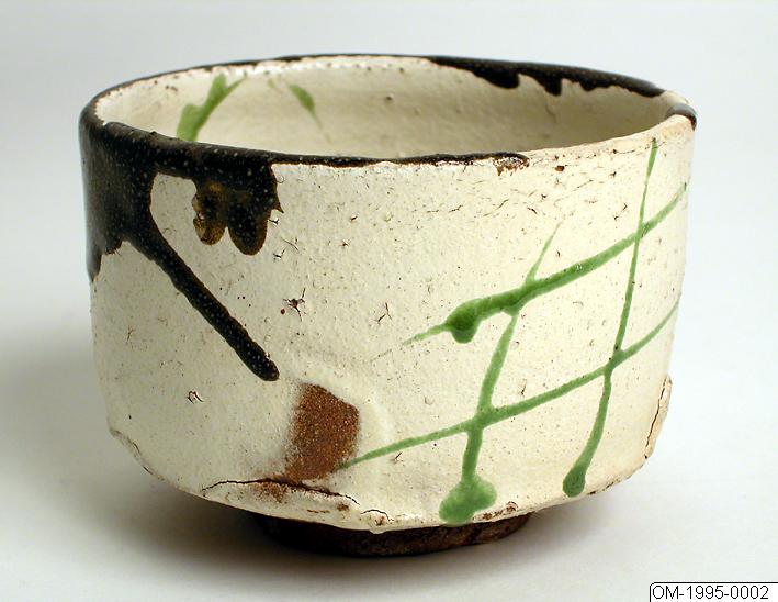 Teskål i Oribe-stil. Stengods; cylindrisk med låg fot och abstrakt mönster i vit, svart och grön glasyr. Tillverkad 1993. Något oregelbunden form. Signerad Tsujimura Shiro.