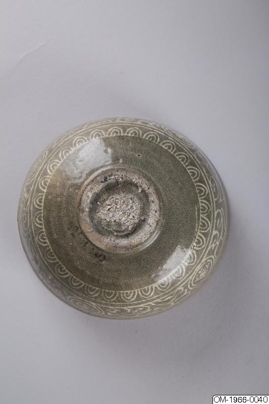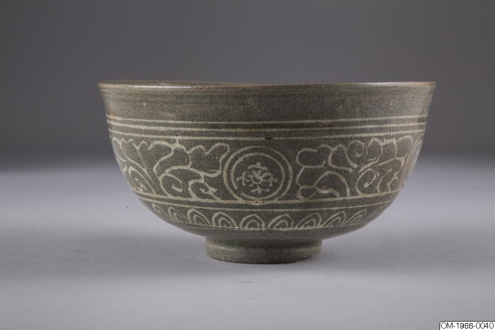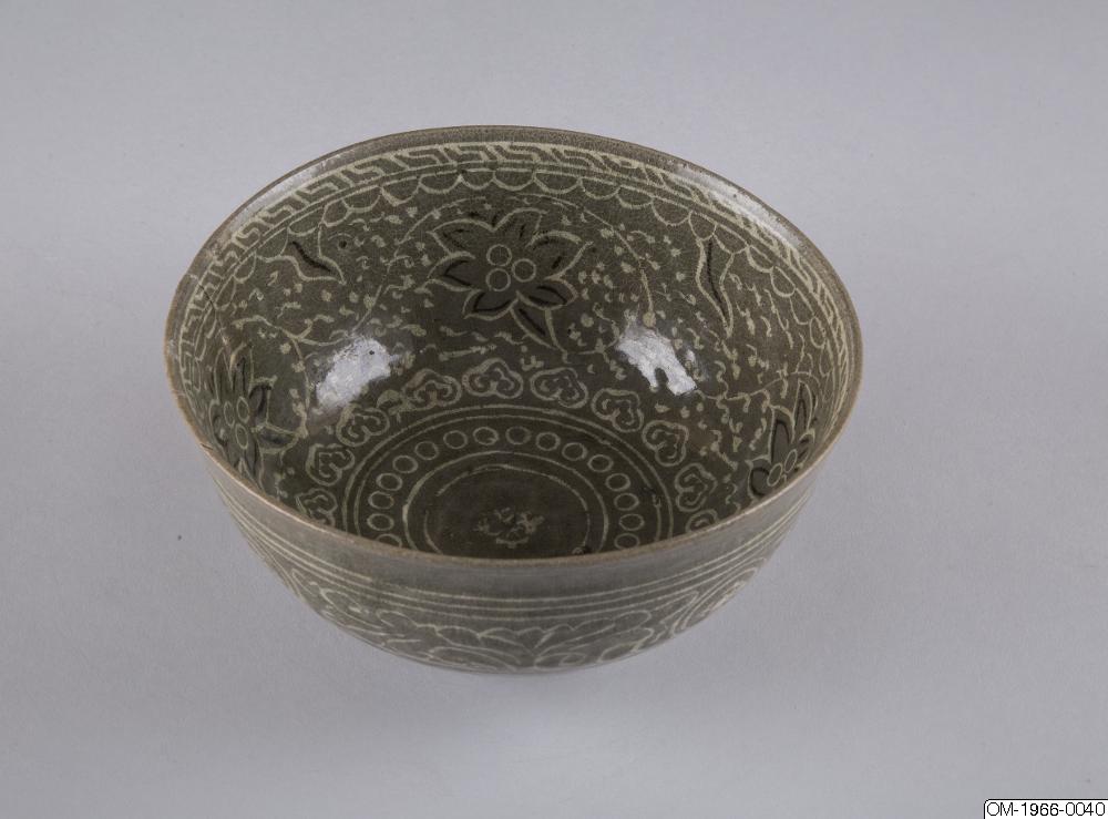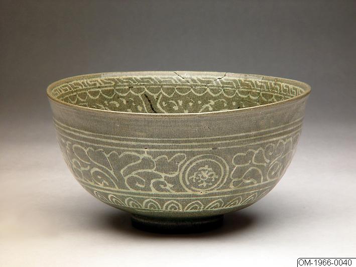 Det här kärlet har en lätt utsvängd mynning och sidor som går i en mjuk båglinje från kanten ner till foten. Ytan på insidan har ett myllrande inlagt mönster (sanggam på koreanska). En stiliserad blomma syns i en dubbel ring i bottens mitt. Över den finns ett band av små cirklar och en band med yeoui-huvuden (lyckobringande molnformade symboler) inramade i dubbla linjer. Väggarna är täckta med större mönster som innefattar fyra lotusblommor och slingor i vitt och svart. Utrymmet mellan huvudmönstret är täckt av prickar och linjer som skulle kunna föreställa växlighet. Mönstret tar slut med en flikig rand och ett band med flätverk (beongae muni på koreanska - åskmönster). Utsidan har ett stort mönster med fyra blommedaljoner som har slingor med löv mellan sig. Dessa är inramade av linjer som går runt hela skålen och ett band med stiliserade lotusblad. Skålen är täckt i en fint krackelerad grönaktig glasyr men ytan har en gråaktig färg. Fotringen är fint utskuren och glaserad. Grova sandkorn sitter fast på basen och på fotringen, troligtvis från brännugnsstöd. När brännugnsstöden togs bort följde bitar av foten med.