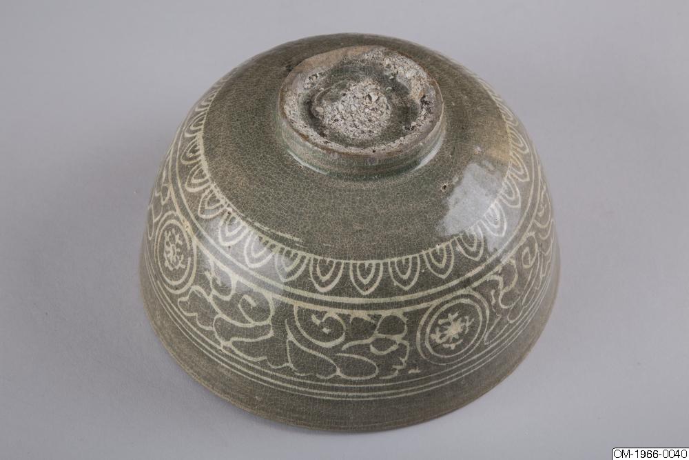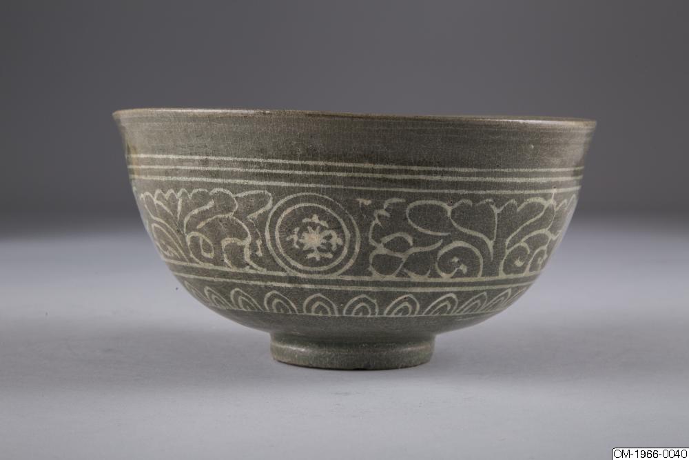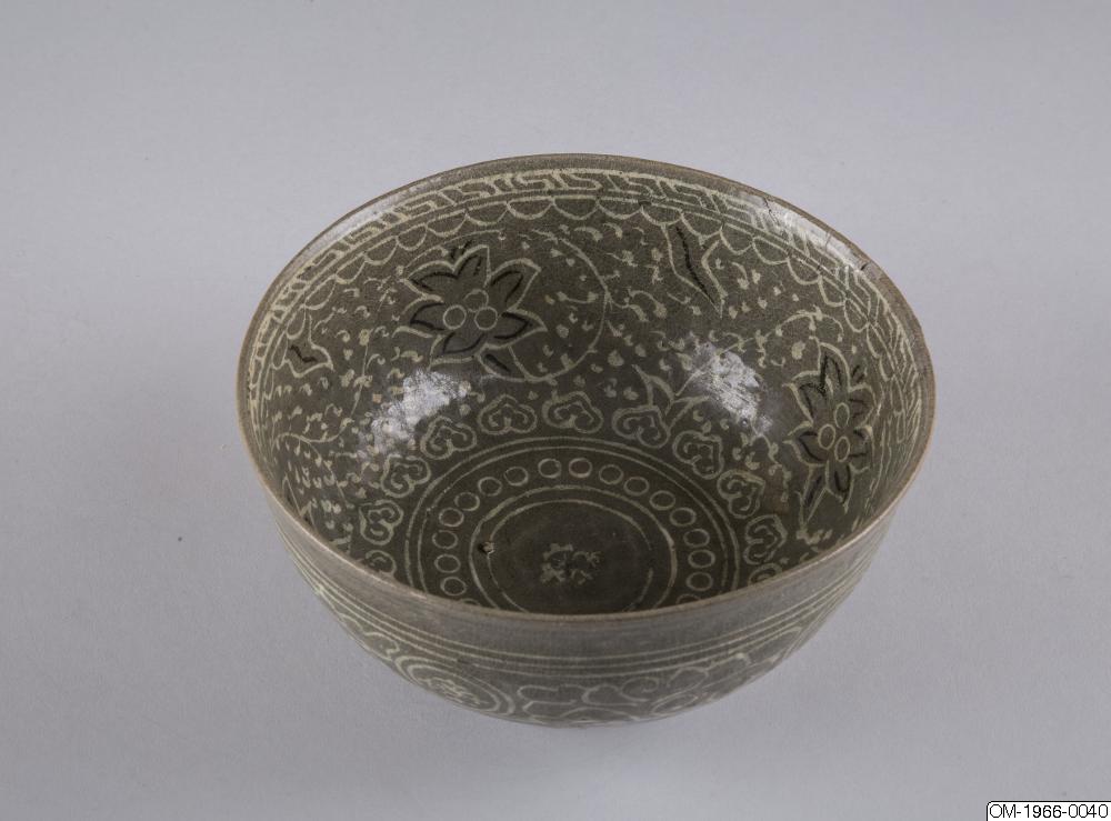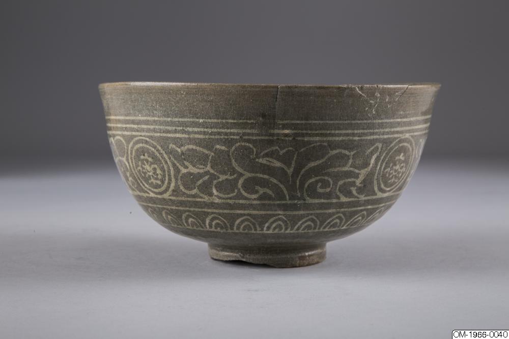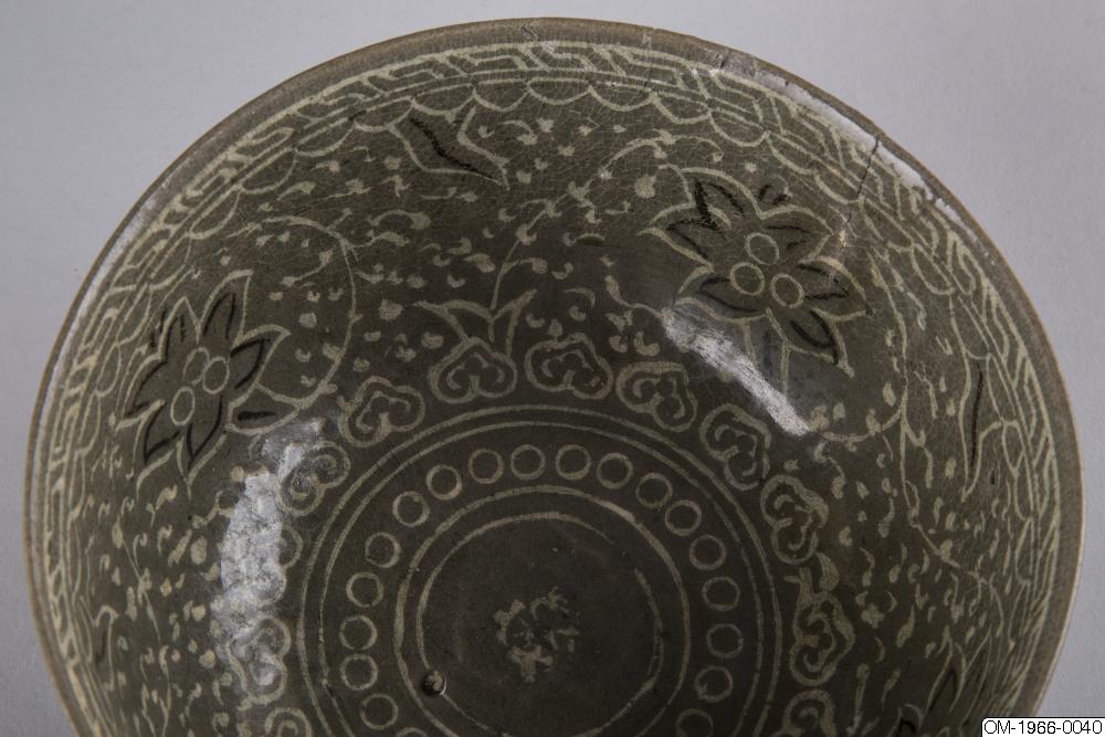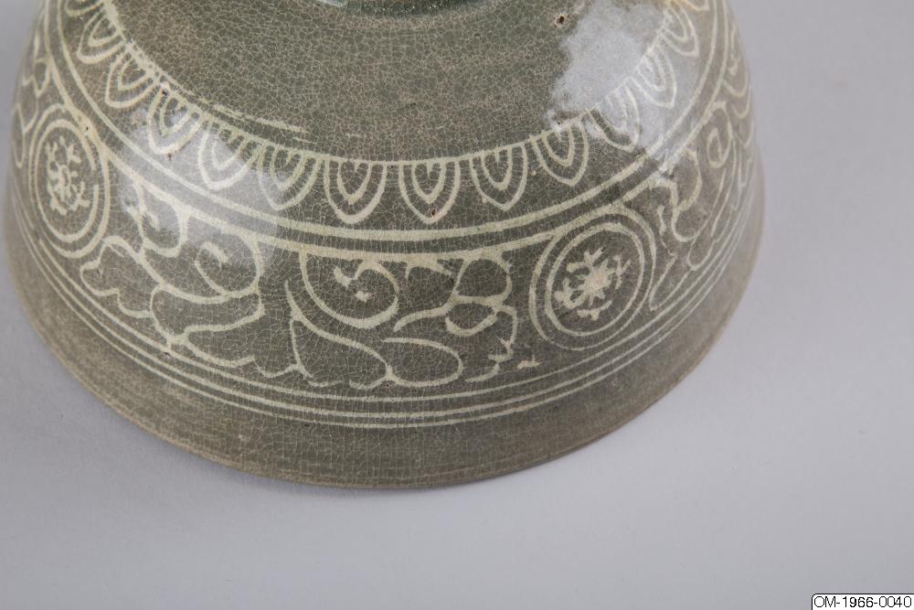Den mycket täta dekoren, upprepningarna i mönstret och typen av stiliserade lotusslingor, samt den genomgående gråa tonen och kvaliteten på glasyren pekar på att det här föremålet kommer från senare delen av Goryeo. Ett mycket liknande mänster finns på en skål med en inlagd inskription som är daterad till det senare 1300-talet och nu finns på Koreas nationalmuseum (Accessionsnr. 003439-000). Keramik från den här tiden, som var en övergångstid från Goryeo till Joseon uppvisar redan drag som är karaktäristiska för buncheonggods, som innefattar den mesta av keramiken som producerades under tidig Joseon.