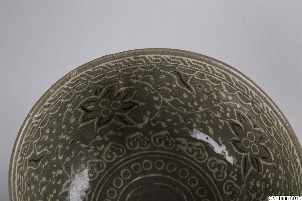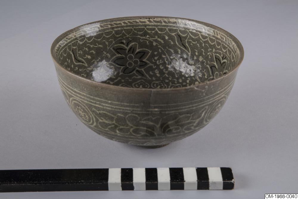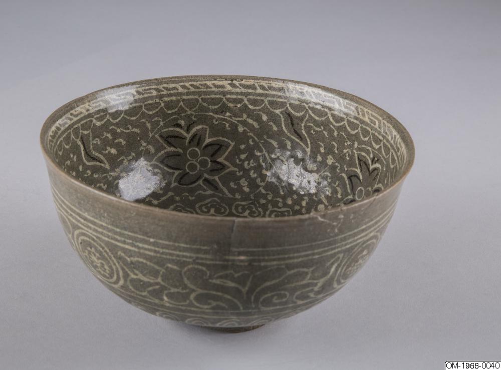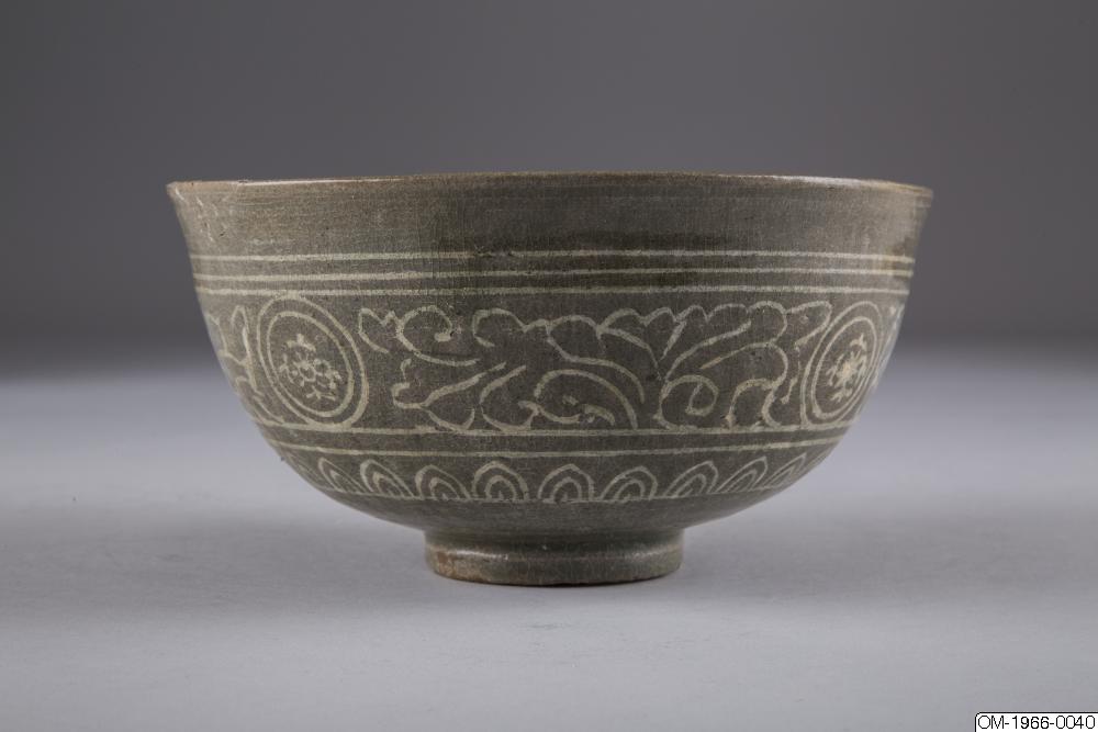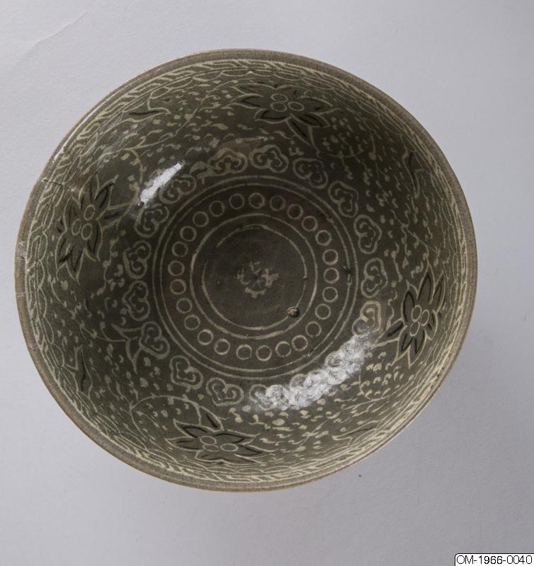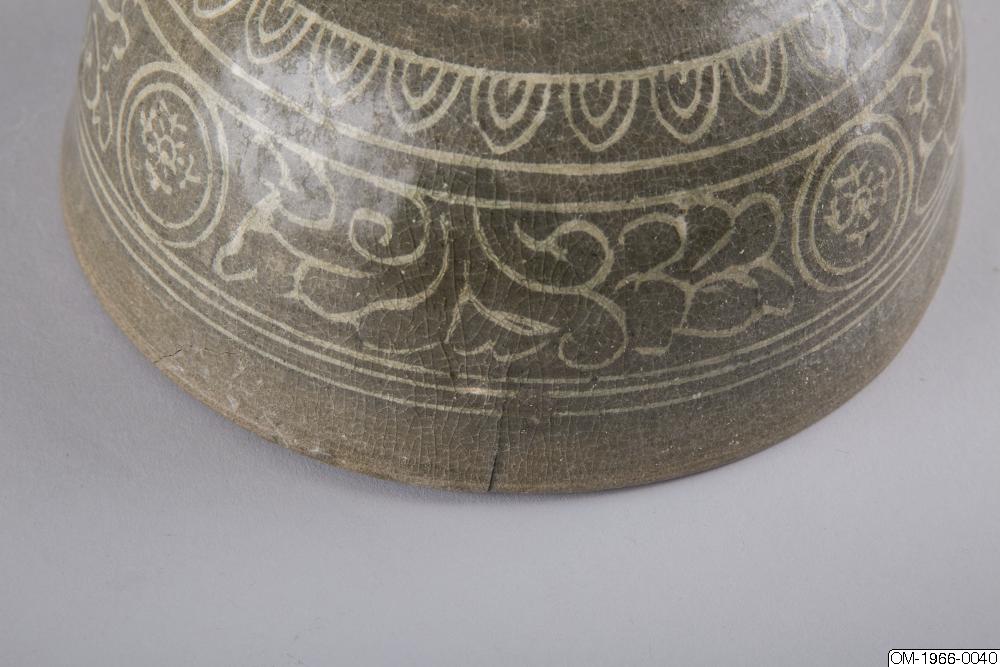 Den mycket täta dekoren, upprepningarna i mönstret och typen av stiliserade lotusslingor, samt den genomgående gråa tonen och kvaliteten på glasyren pekar på att det här föremålet kommer från senare delen av Goryeo. Ett mycket liknande mänster finns på en skål med en inlagd inskription som är daterad till det senare 1300-talet och nu finns på Koreas nationalmuseum (Accessionsnr. 003439-000). Keramik från den här tiden, som var en övergångstid från Goryeo till Joseon uppvisar redan drag som är karaktäristiska för buncheonggods, som innefattar den mesta av keramiken som producerades under tidig Joseon.