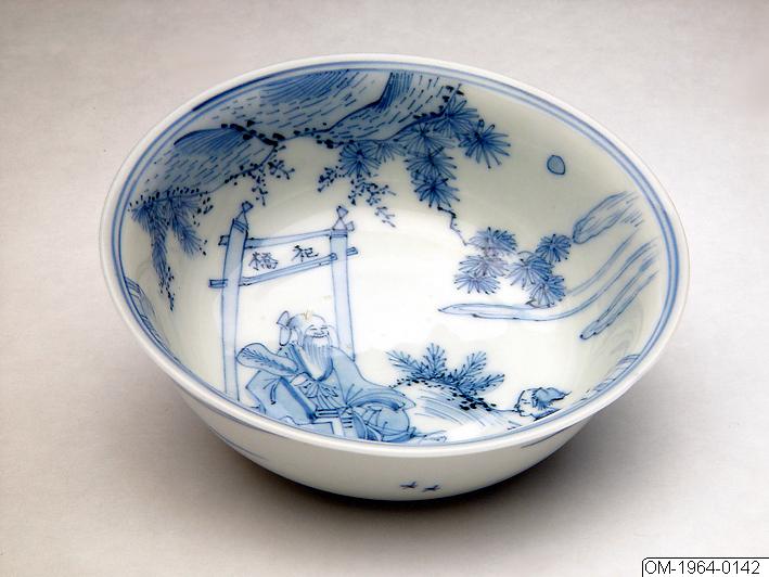 Dekorerad i underglasyrblått. På insidan landskapsscen med en gammal skolar som satt sig på en bro under en port, markerad med shi qiao (tillbedjans bro), med en lärjunge framför sig. Orkidéstånd på utsidan.