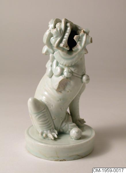 Figurin av porslin i form av sittande lejon med en boll på en cirkelformad bas.