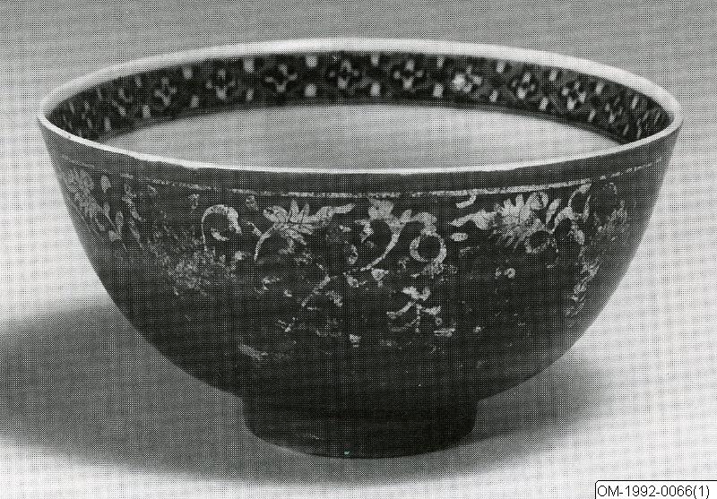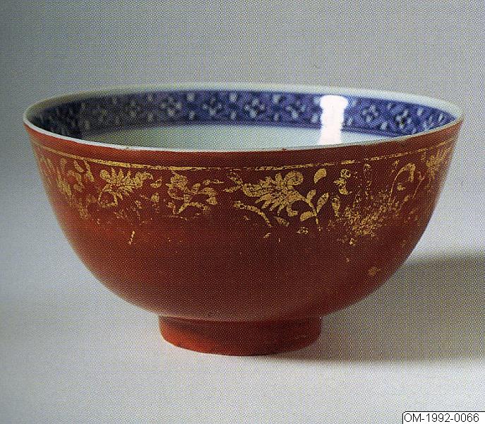 Skål av porslin i Kinrande-typ. Konvexa, rundade sidor och låg fot. Järnröd emaljfärg på utsidan med blomdekor i guld. Insidan dekorerad i underglasyrblått, i spegeln två krysantemer inom dubbla cirklar, längs mynningen rutbård.