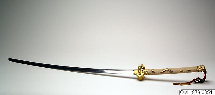 Svärd med metallklinga och kavel klädd med rocka/hajskinn samt försedd med lädersnodd. Enligt kataloguppgift (se Publicerat): hovmonterat svärd (efu-no-tachi), signerat: Namino-(no)-hira-Yasukuni. Sannolikt sent 1600-tidigt -1700-tal.