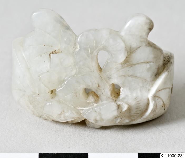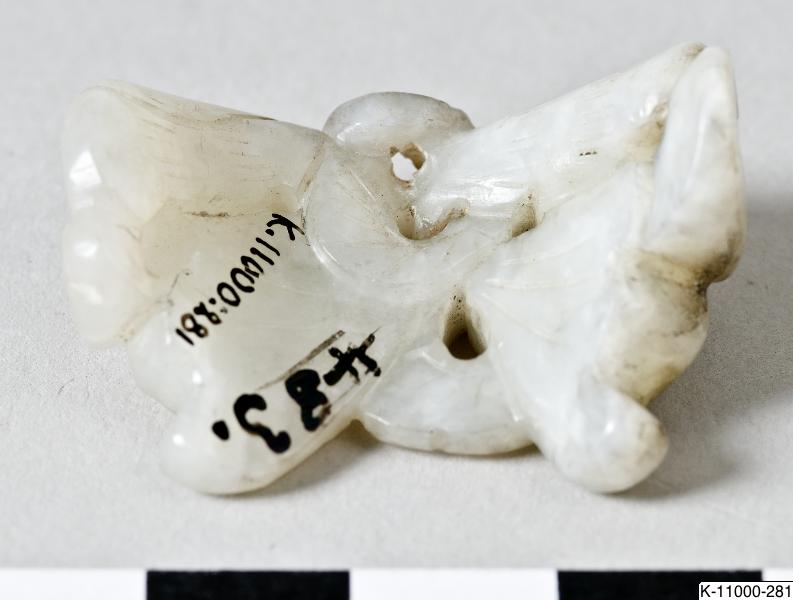 Välvt föremål i form av två motställda fladdermöss i delvis genombrutet arbete. På föremålet finns numret “483” skrivet i svart färg.