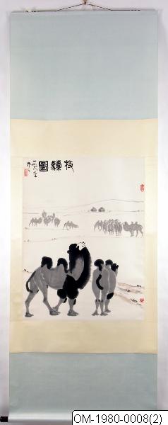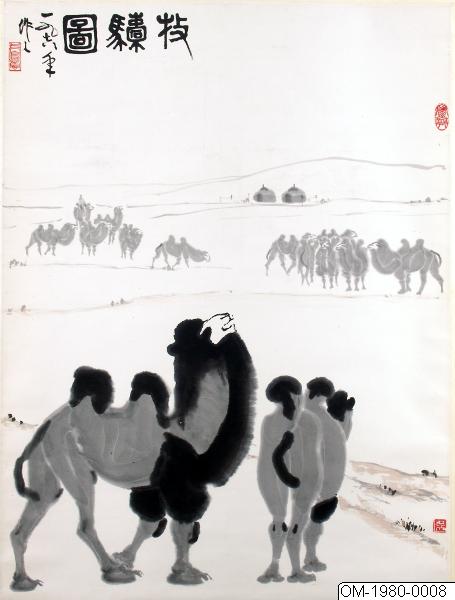 - Två kameler syns i förgrunden, den ena från sidan, den andra bakifrån. I bakgrunden två mongoliska tält. Tusch på papper.