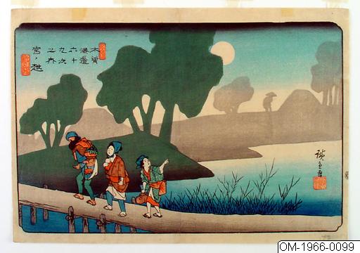 Två kvinnor och en man på en bro, resande på Kisokaido-vägen. En man bär ett äldre barn medan en kvinna bär en baby och en annan bär saker i en furoshiki (omslagstyg).