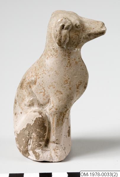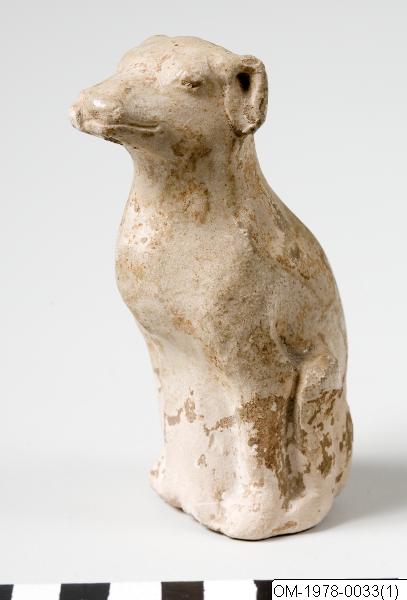 - Sittande hund. Gravfigurin av lergods med halmgul glasyr. Tang.