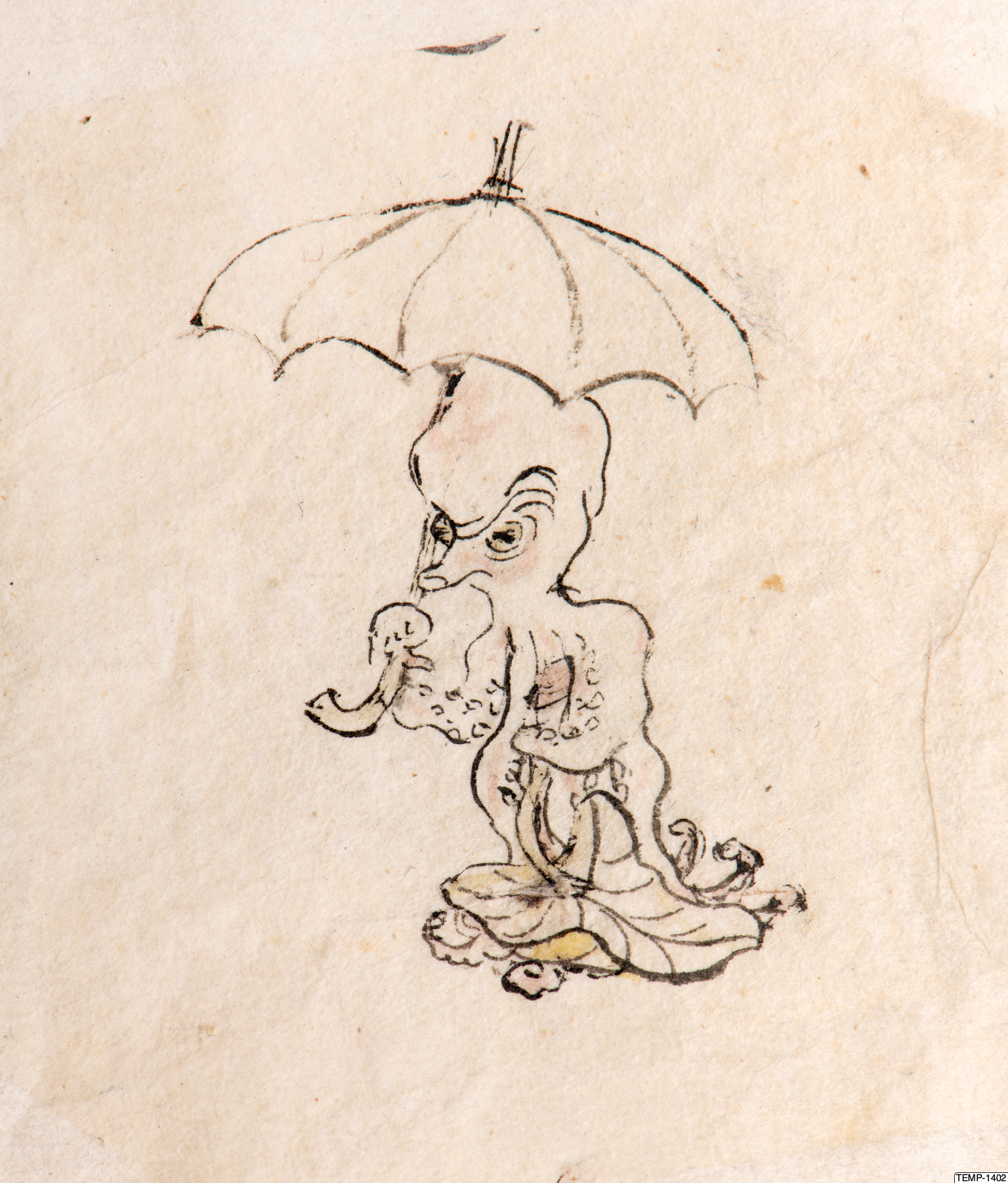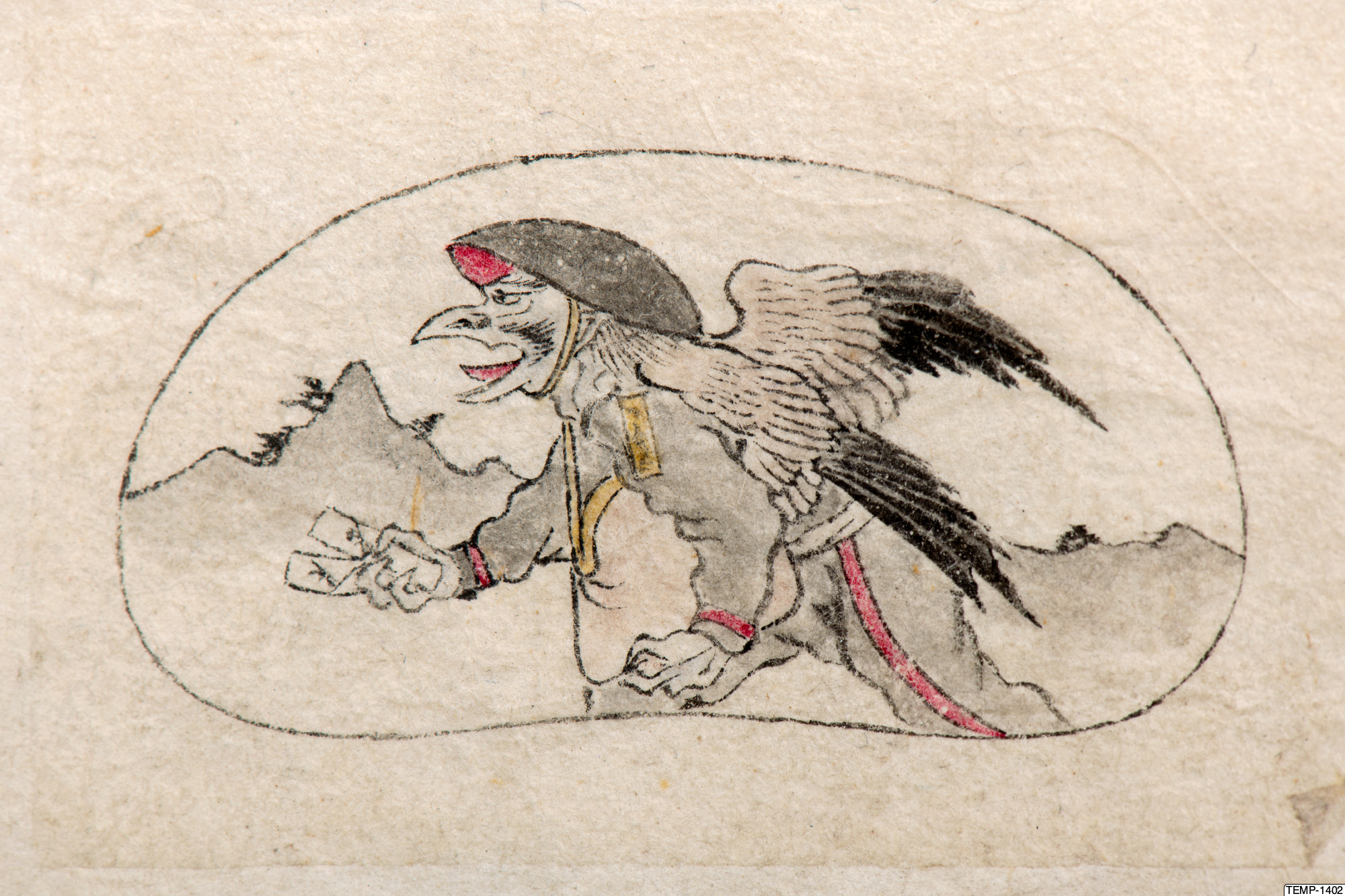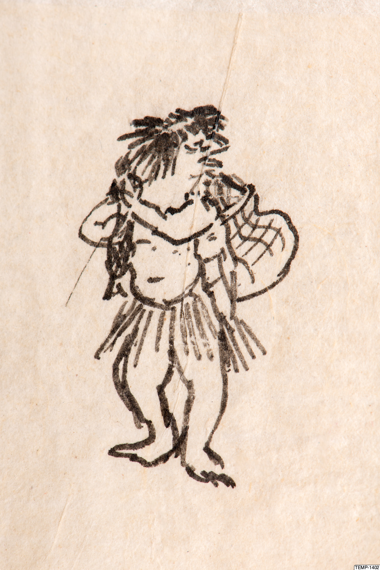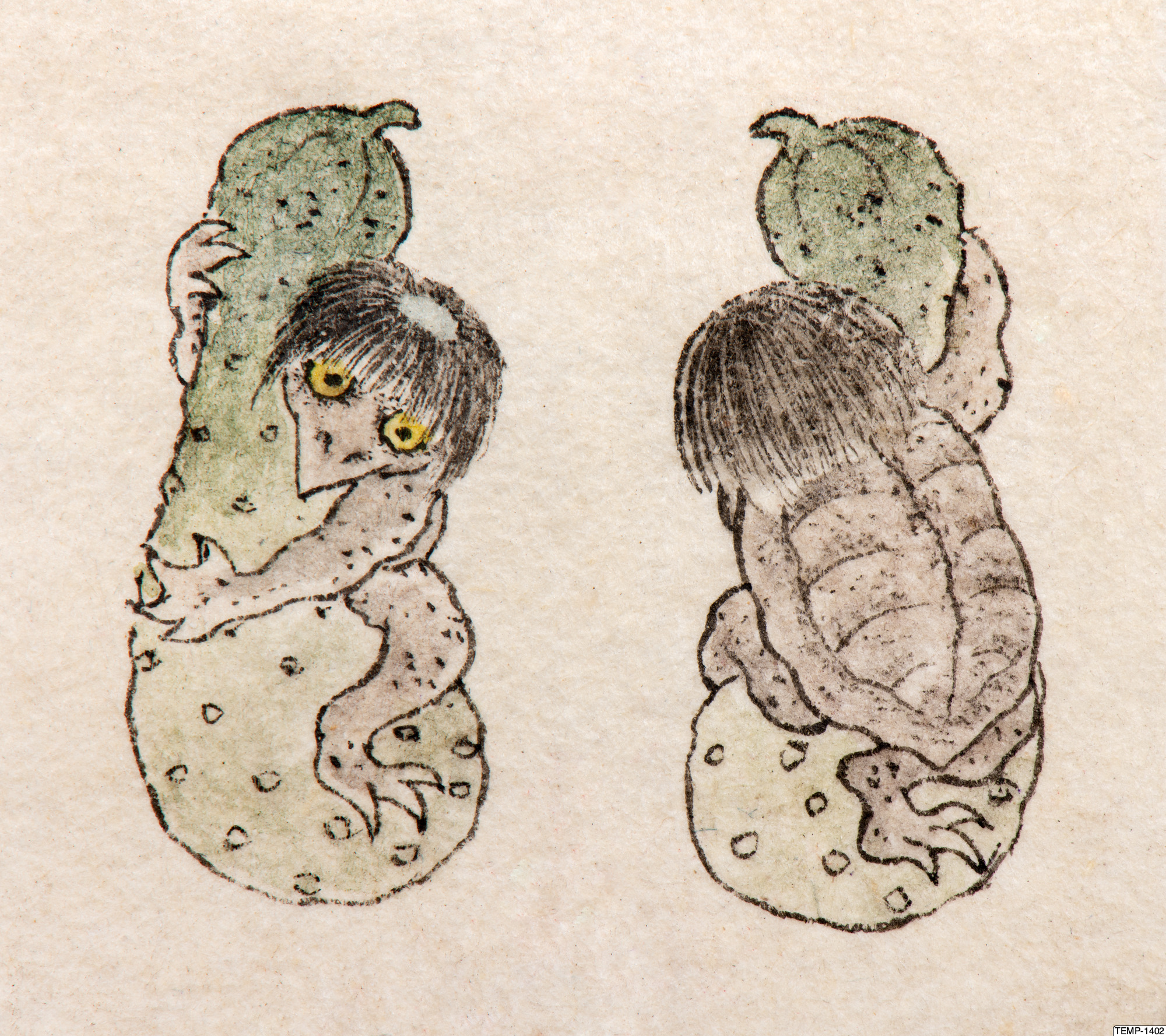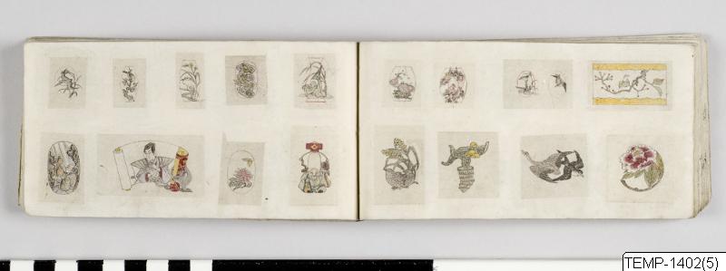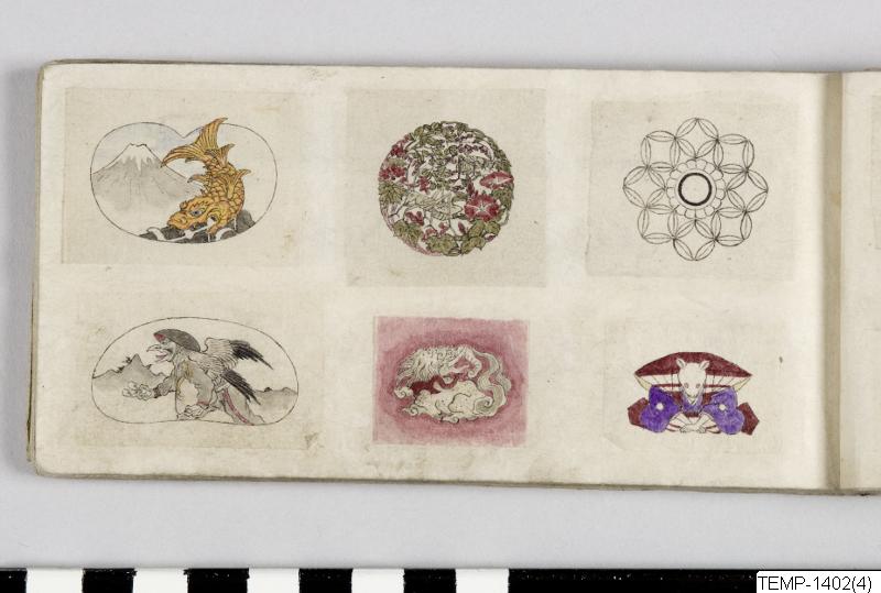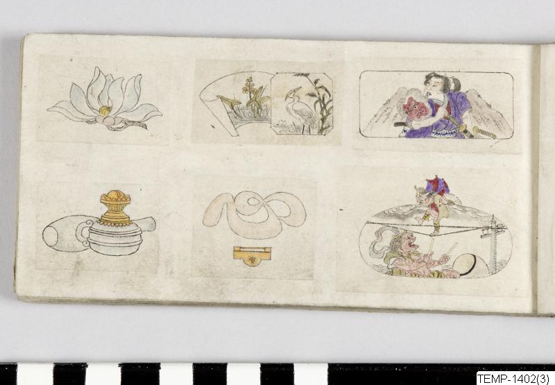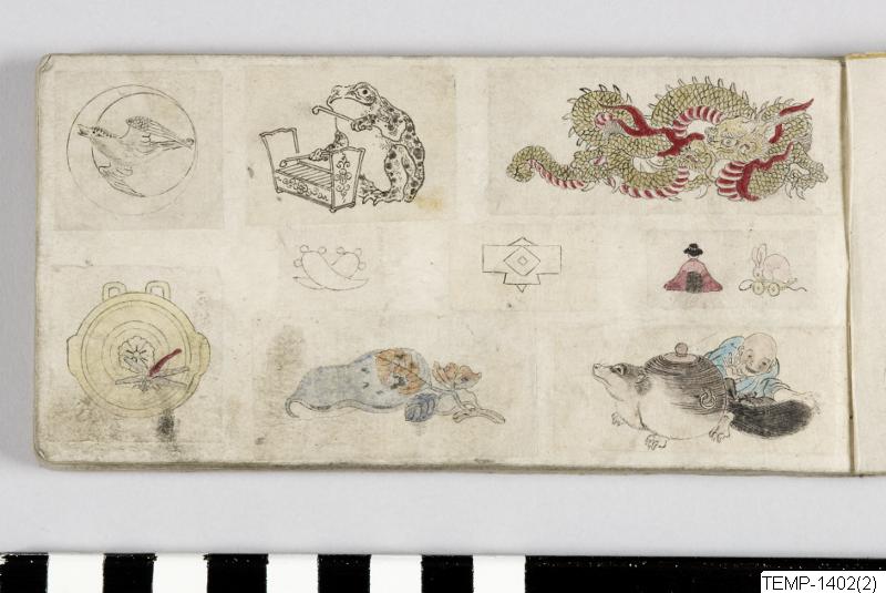 "Skissbok med teckningar av yokaier, blandade med andra motiv som blommor och fåglar. Bilderna ser ut att vara förlagor till hantverk som netsuke eller svärdsfästen. Troligtvis Meiji-perioden (1868-1912)." (utställningstext, Yokai 2024, Etnografiska museet)