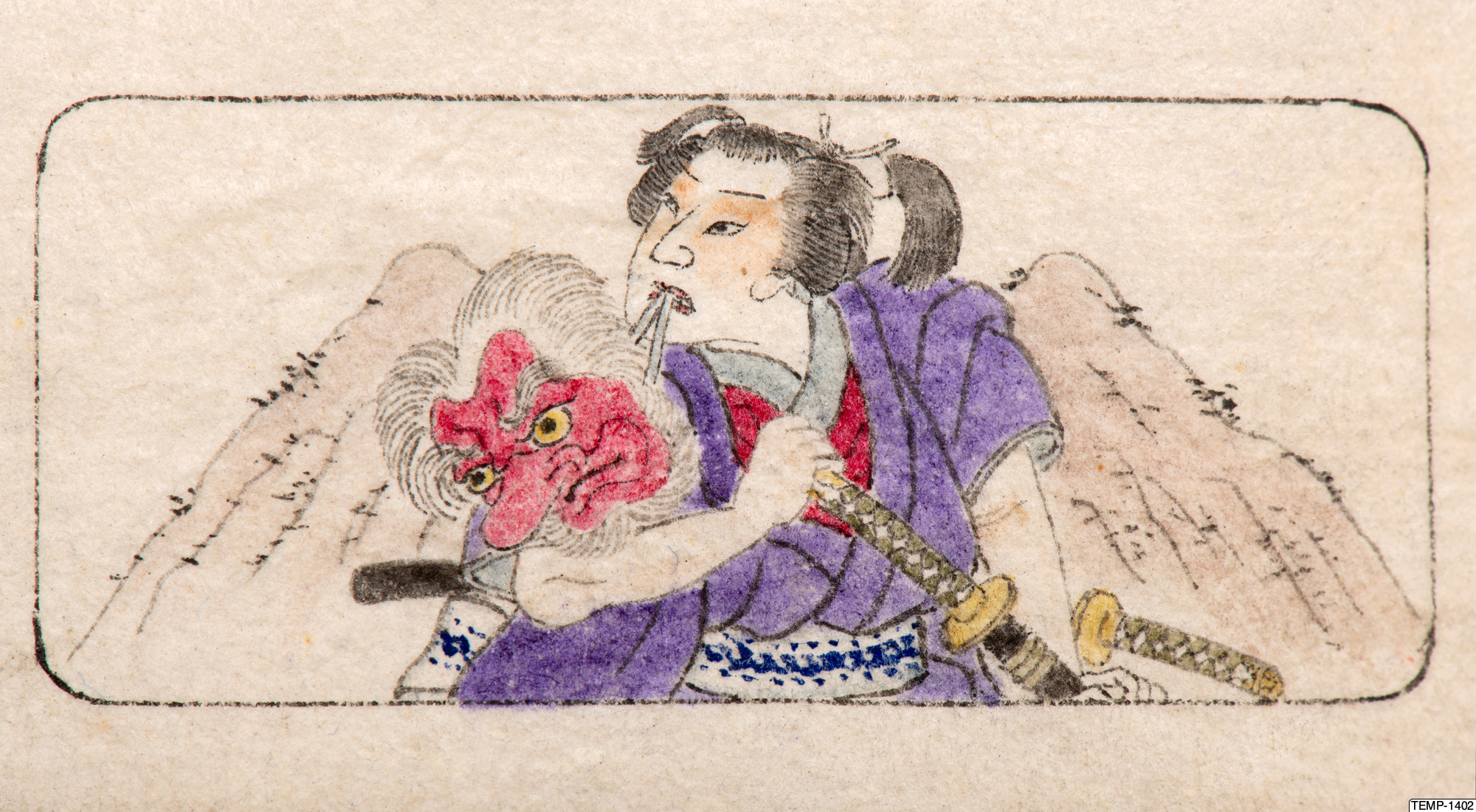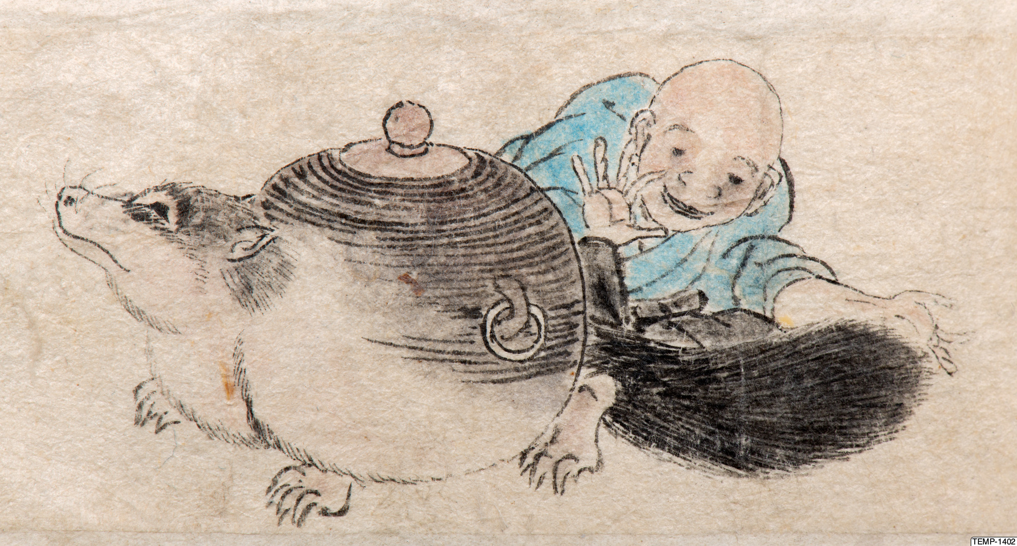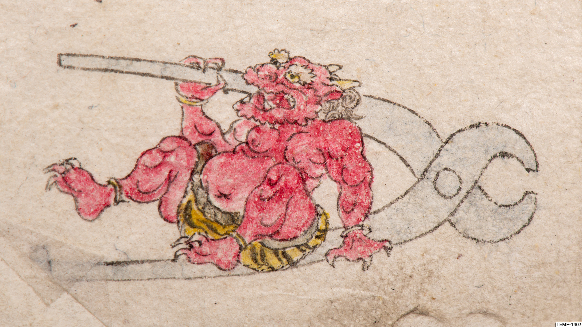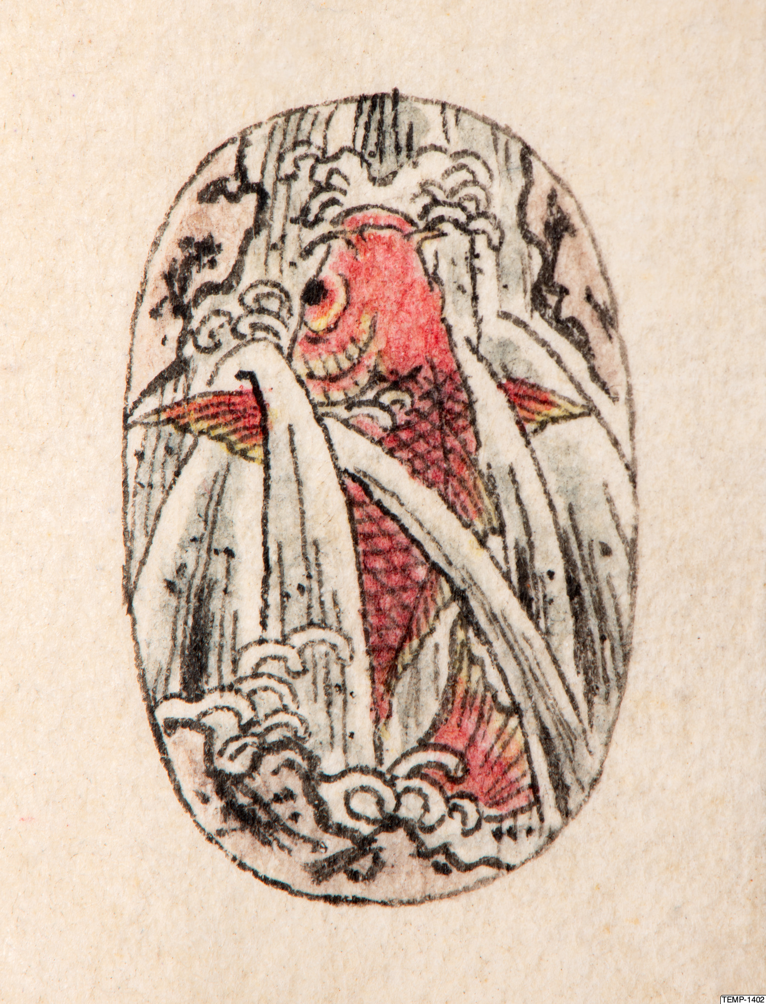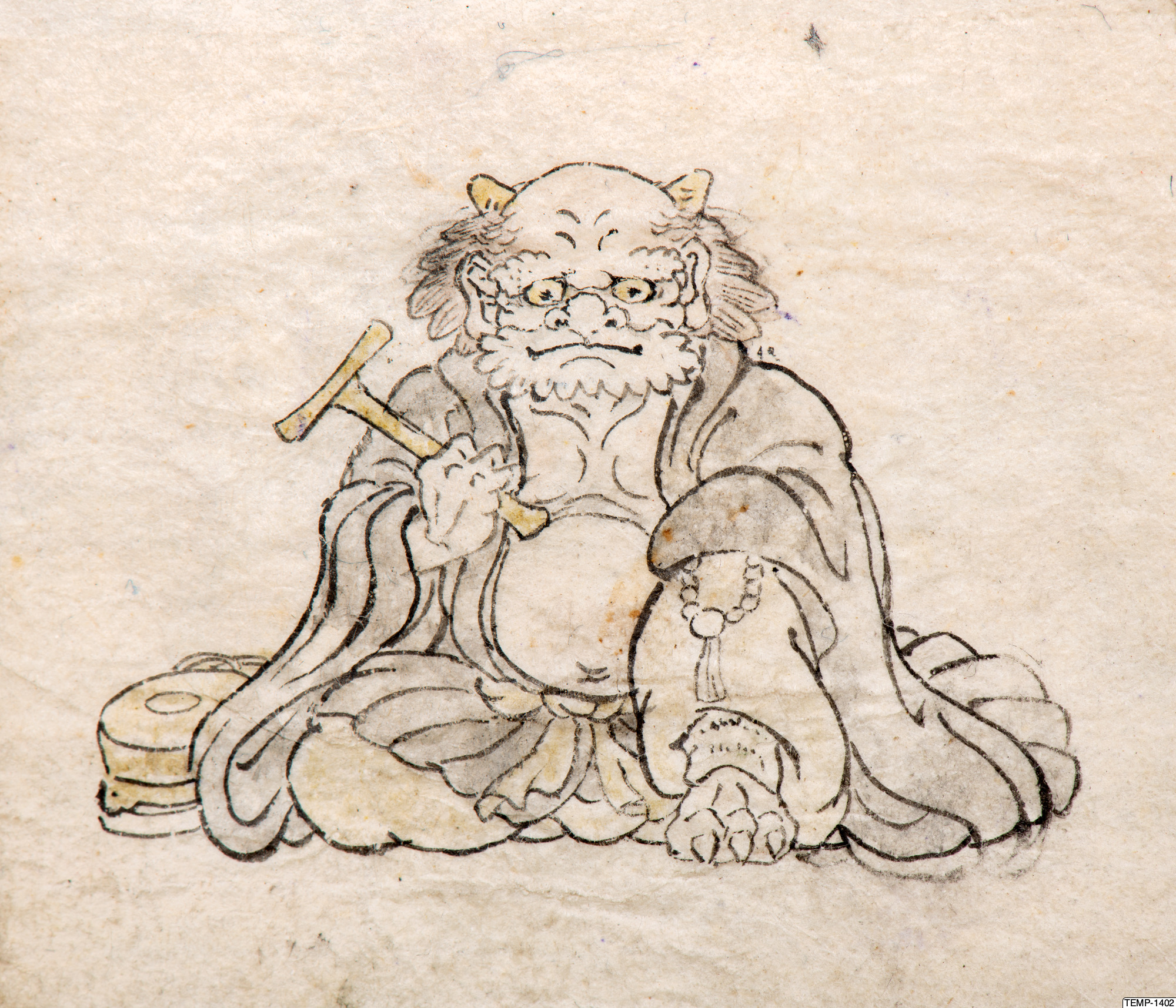 "Skissbok med teckningar av yokaier, blandade med andra motiv som blommor och fåglar. Bilderna ser ut att vara förlagor till hantverk som netsuke eller svärdsfästen. Troligtvis Meiji-perioden (1868-1912)." (utställningstext, Yokai 2024, Etnografiska museet)