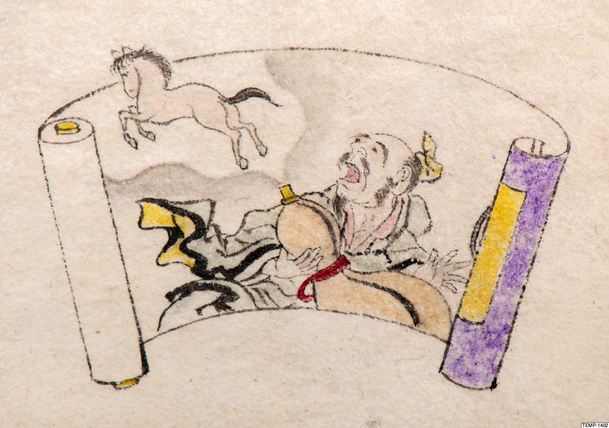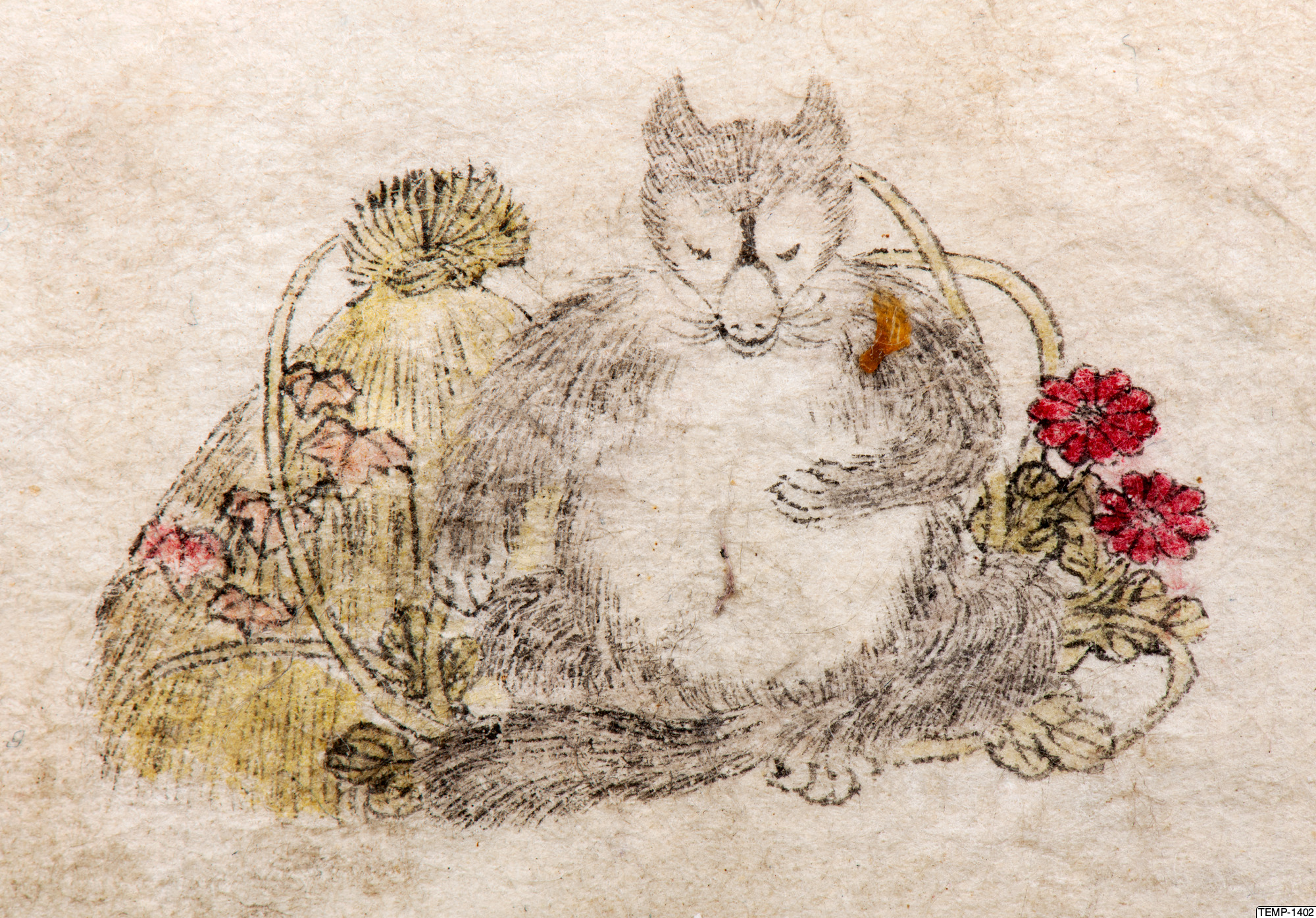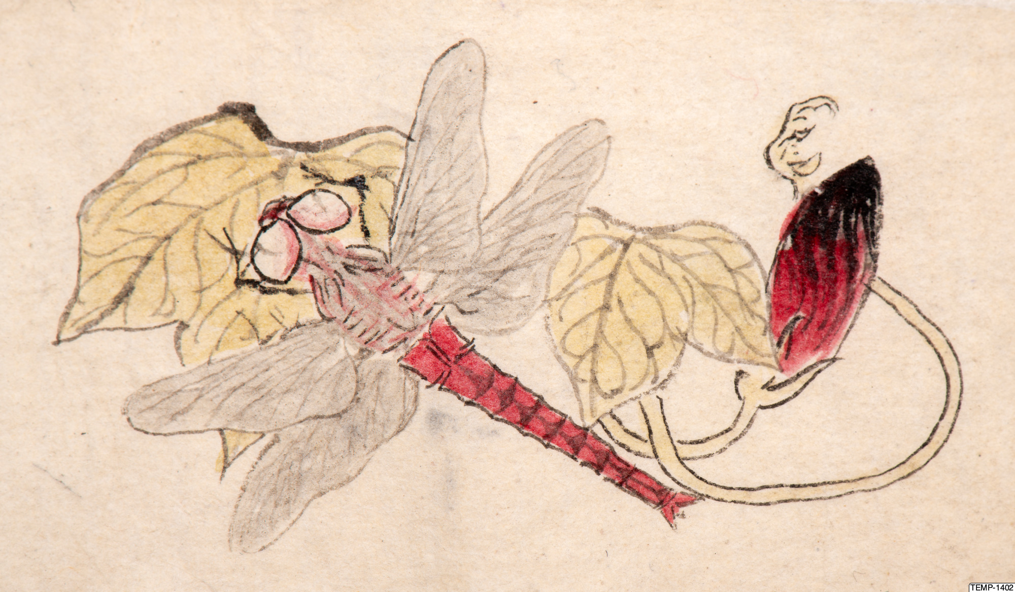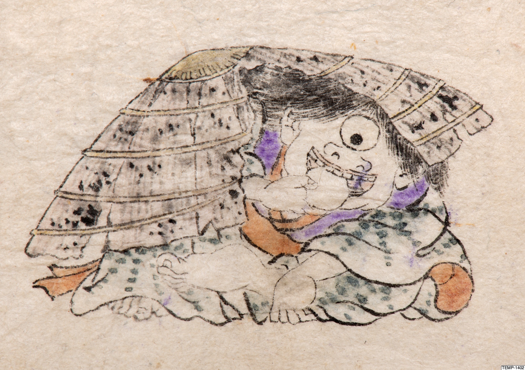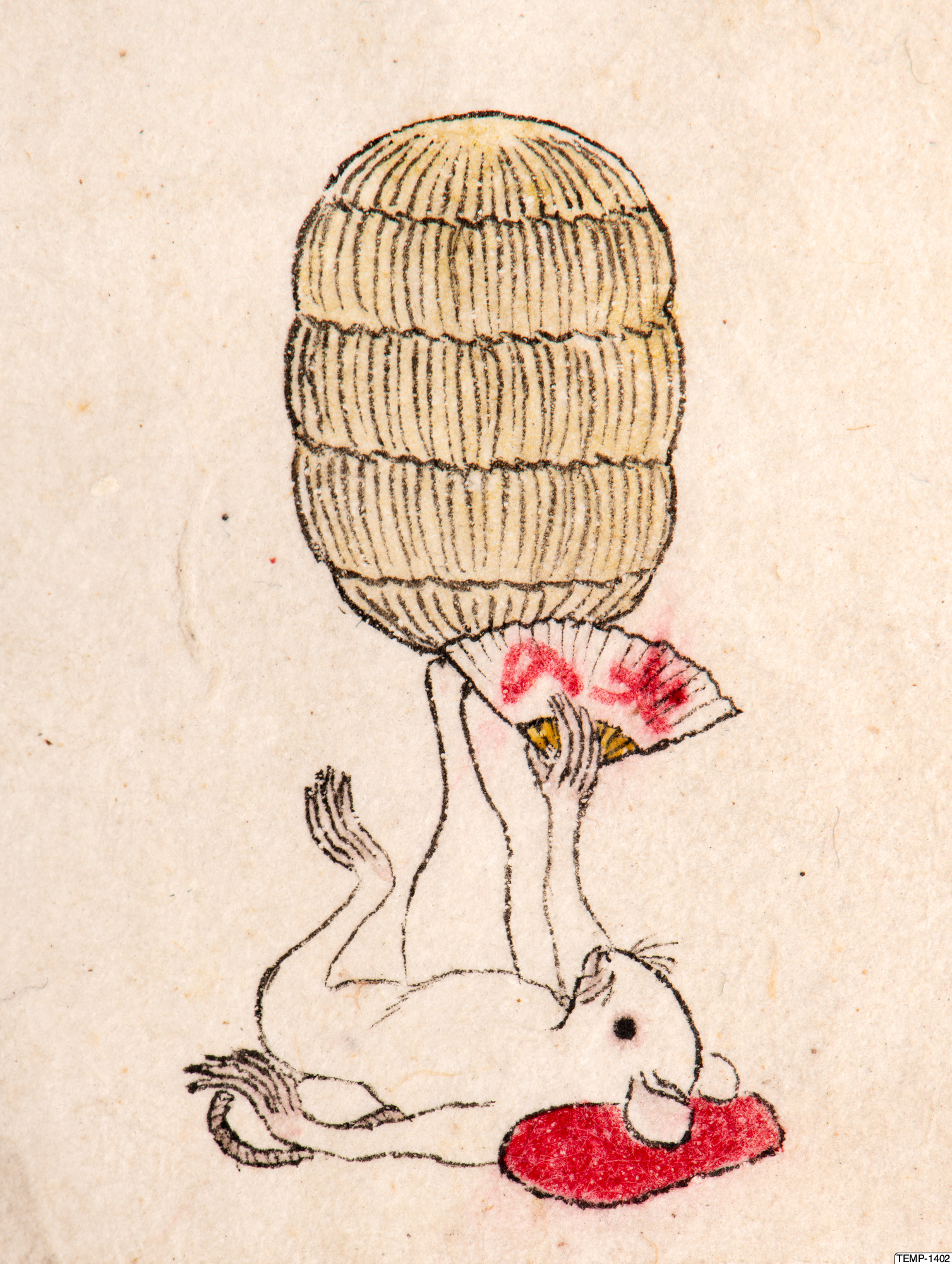"Skissbok med teckningar av yokaier, blandade med andra motiv som blommor och fåglar. Bilderna ser ut att vara förlagor till hantverk som netsuke eller svärdsfästen. Troligtvis Meiji-perioden (1868-1912)." (utställningstext, Yokai 2024, Etnografiska museet)
