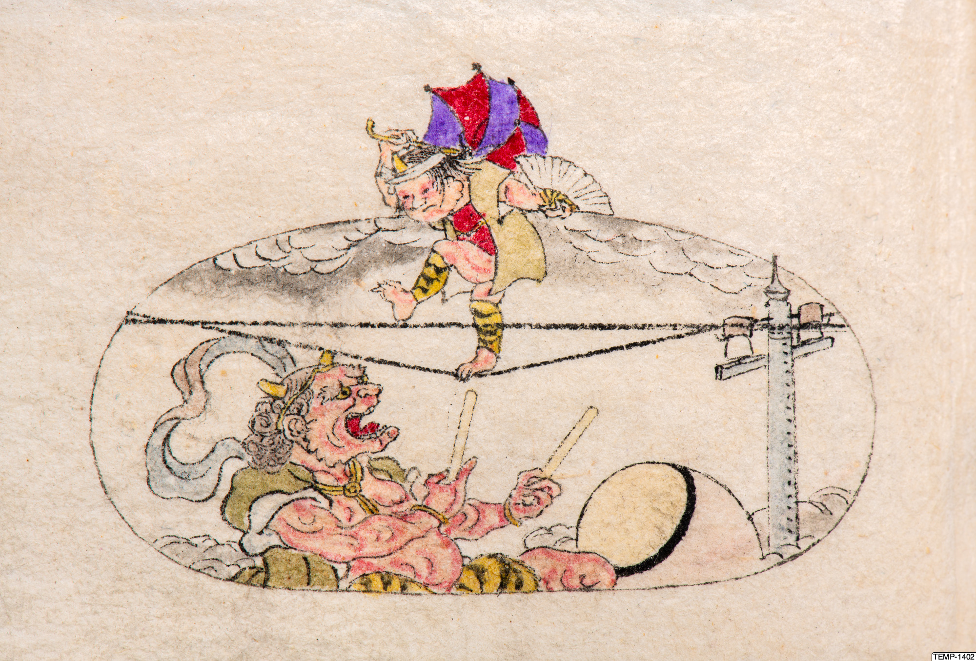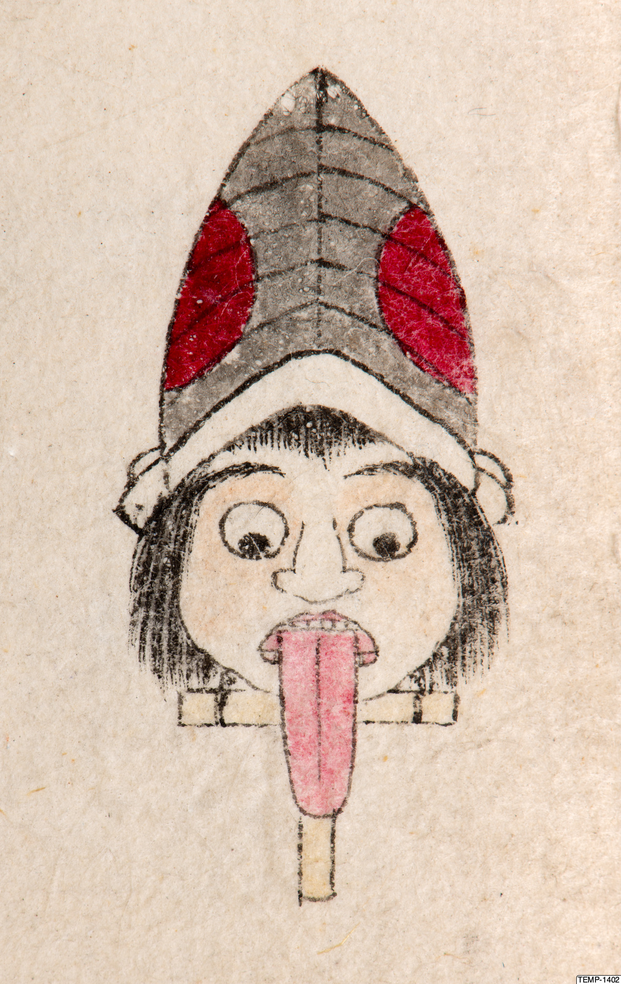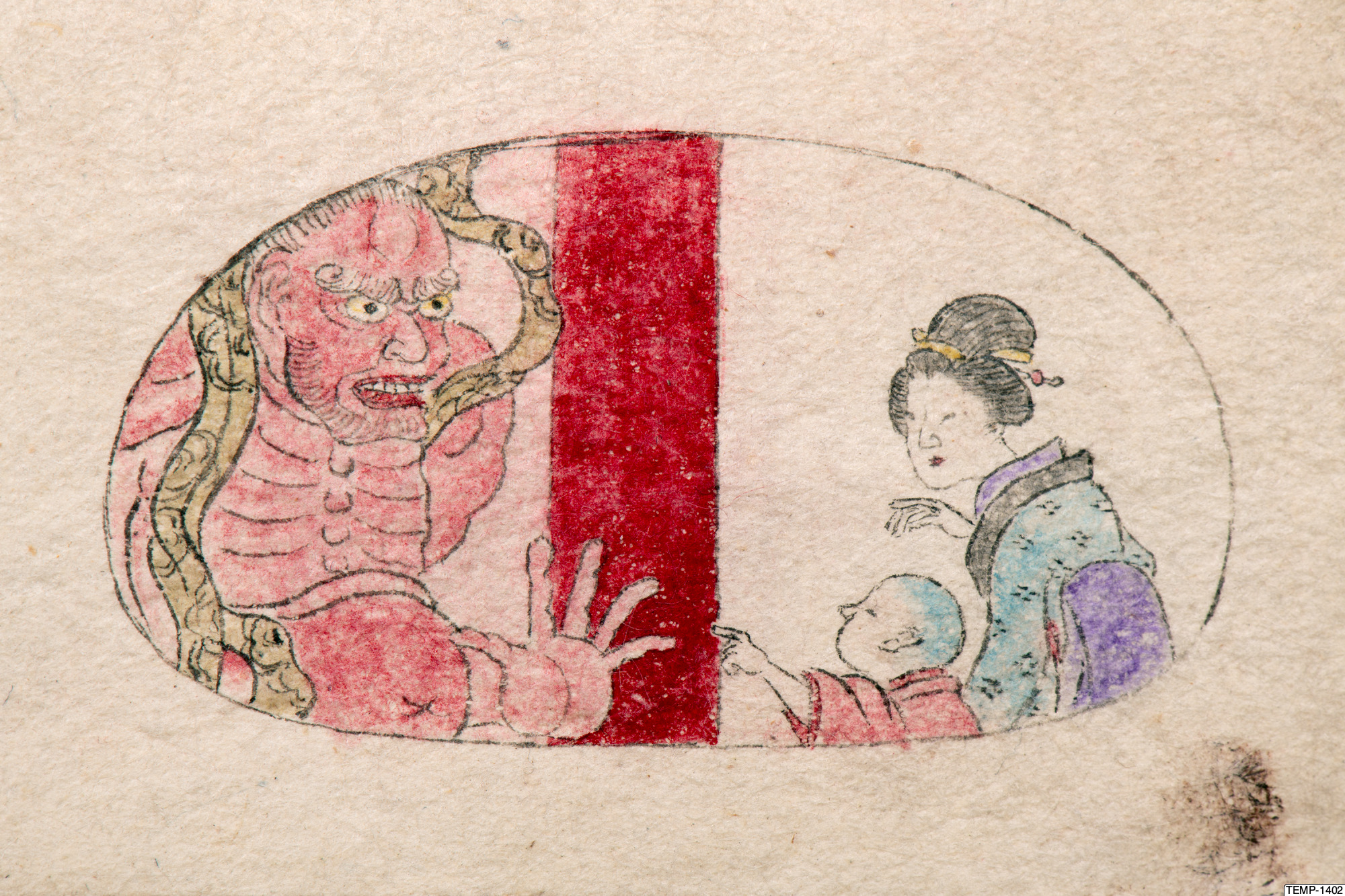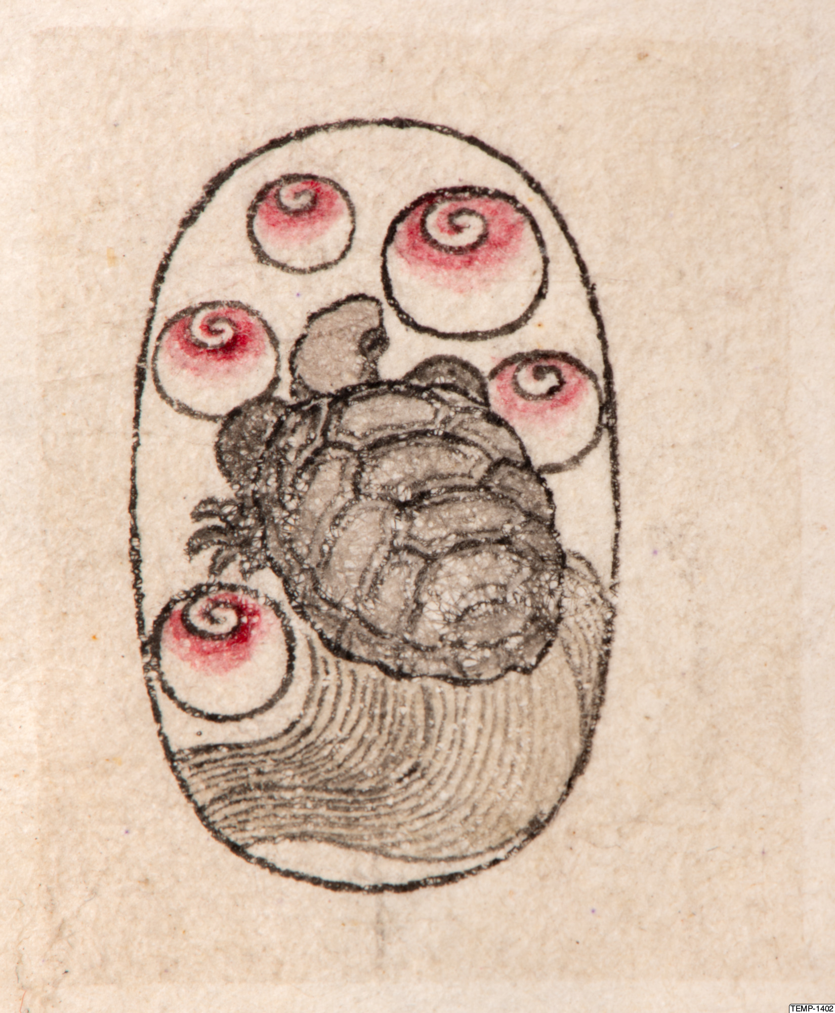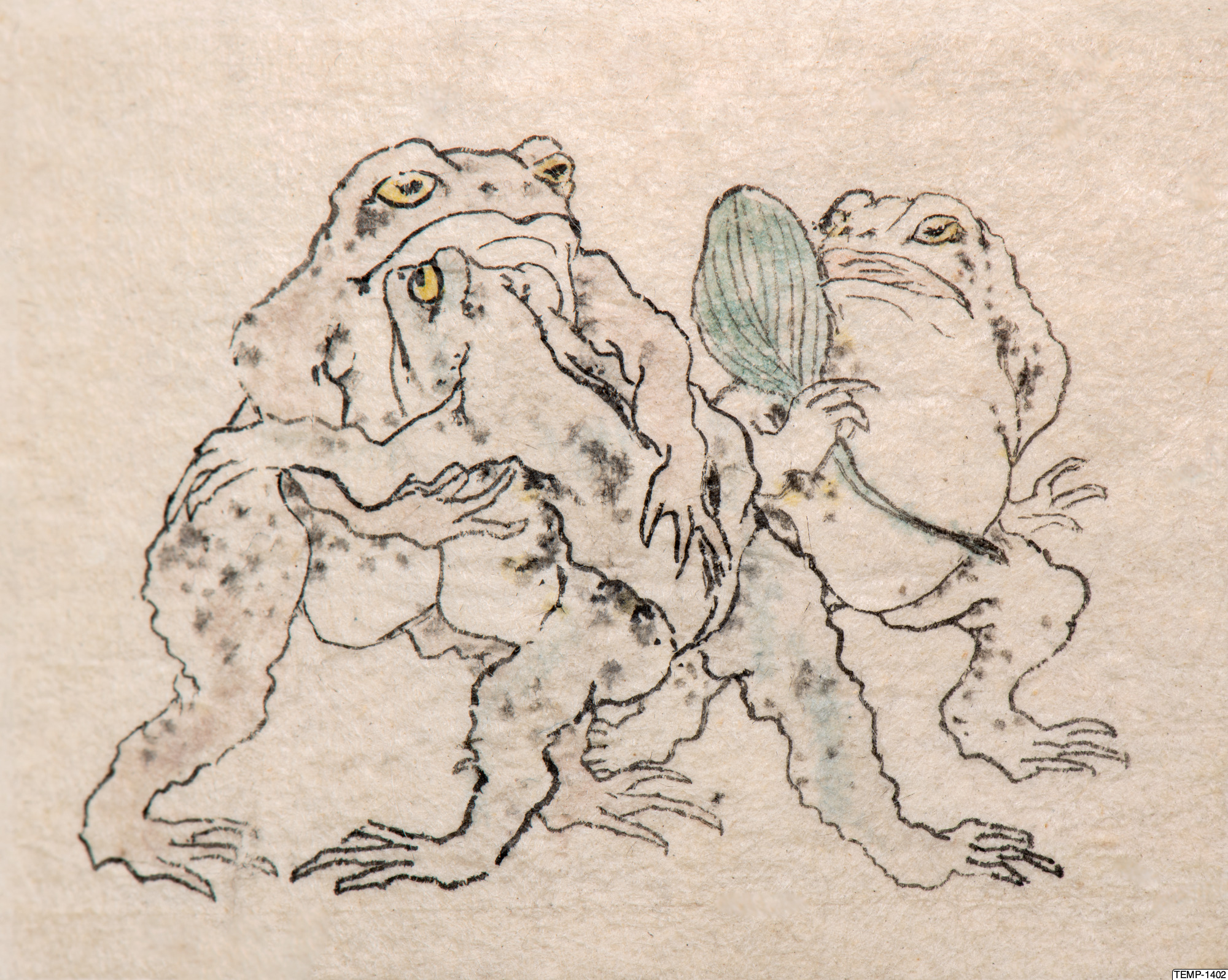 "Skissbok med teckningar av yokaier, blandade med andra motiv som blommor och fåglar. Bilderna ser ut att vara förlagor till hantverk som netsuke eller svärdsfästen. Troligtvis Meiji-perioden (1868-1912)." (utställningstext, Yokai 2024, Etnografiska museet)