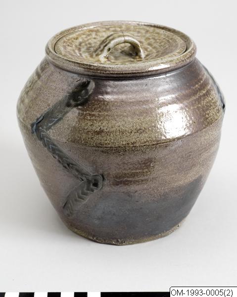 Krukan är gjord av Hamada Shoji (1894-1978), en av Japans mest kända keramiker inom genren folkkonst (mingei). Den har ägts av Wilhelm Kåge (1889-1960). Denne mångsysslande keramiker, målare och konstnärliga ledare på Gustavsberg var en av 1900-talets mest kända svenskar inom formgivning. Hans keramik rymde flera olika stilar och influenser. Troligen skänktes krukan av Hamada till Wilhelm Kåge vid hans Japan-besök på våren 1956. Såtillvida är den en representant för den stora roll japanskt konsthantverk, särskilt keramik, spelade under 1900-talet, globalt sett. Kåge anordnade också en utställning på NK med japansk keramik 1957. Från hans samling äger museet också ett träsnitt av Munakata Shiko (1903-1975) och en skål av Kawaji Kanjiro (1890-1966). Dessa tre konstnärer och konsthantverkare kan alla räknas till folkkonströrelsen (mingei).