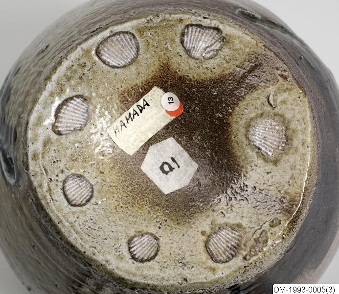 This pot is by Hamada Shoji (1894-1978), one of Japan´s best-known potters in the folk art (mingei) genre. It belonged to Wilhelm Kåge (1889-1960) a versatile potter, painter and artistic director at the Gustavsberg factory and one of the best-known 20th century Swedish designers. His pottery incorporated several different styles and influences. This pot was probabaly given to him by Hamada when he visited Japan in 1956, thus embodying the important role played by Japanese appled arts, ceramic art especially, on the 20th century global scene. Kåge arranged an exhibition of Japanse ceramic art at the NK department store, in 1957. The museum has two other items from his collection, namely a woodblock print by Munakata Shiko (1903-1975) and a bowl by Kawaji Kanjro (1890-1966). All three of these artists and artist-craftsmen can be numbered among the folk art movement (mingei).