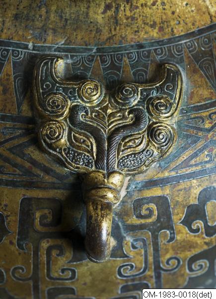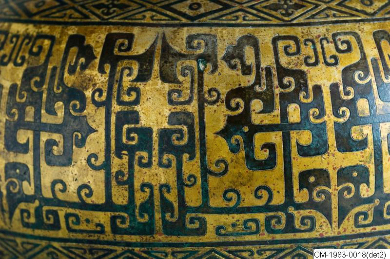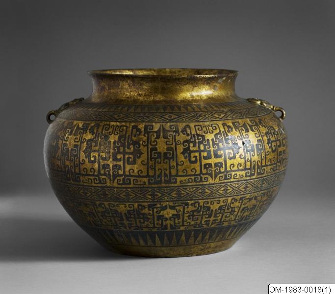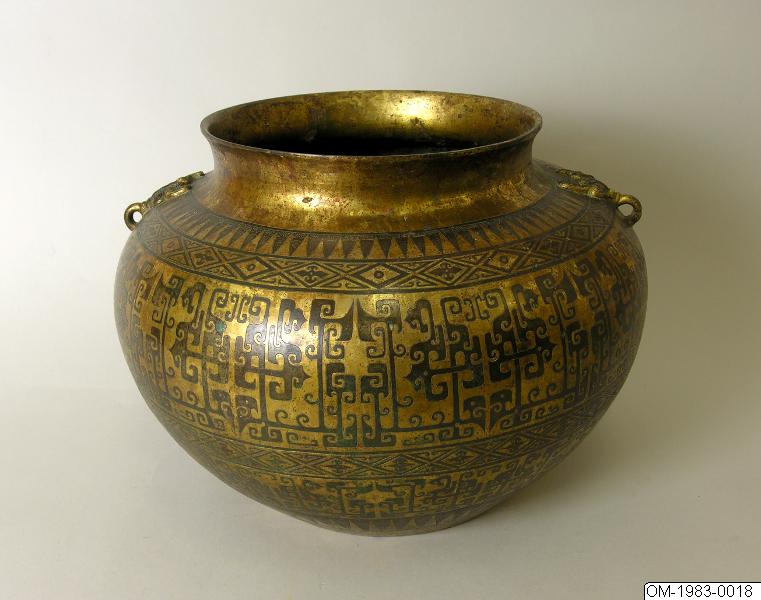 Kärl av pou-typ i förgylld brons med rik inläggning i silver av arkaiserande ornamentik.