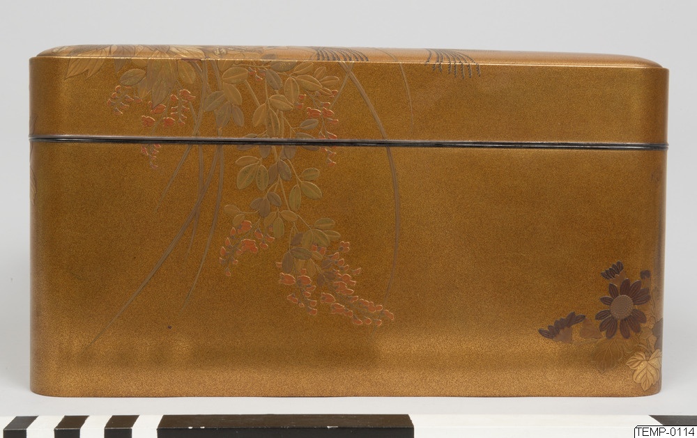 Ask med lock av lackerat trä, från Japan. Asken är dekorerad med olika sorters guldlack i rika blommönster på utsidan och på lockets ovansida (bl a pion och krysantemum). Inuti lackerad med metallpuderlack. Inuti finns ett vikt papper med två skrivtecken, inuti vilket förvaras tre ark med kalligrafi.
