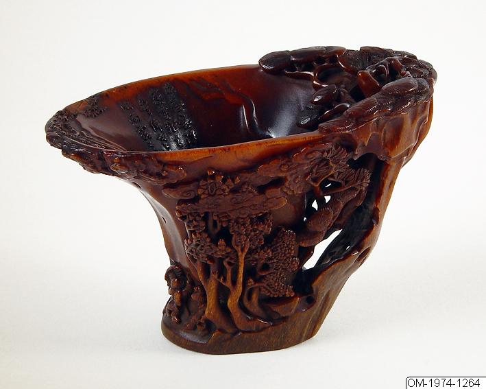 Enligt katalogkort: “Chinese rhinoceros wine cup. Period: Early Ming. Description: Exterior shows a variety of landscape motifs: in centre a waterfall appears from mountains; at the left, a boy rides on a waterbuffalo, and two walking men. A cliff in open-work forms the handle. Interior decorated with a rocky landscape, a tree, a waterfall, and a carved poem. Two characters on exterior; name of unknown artist. Measures: H. 100mm L. 141mm. Purchased: Bequest of H.M. King Gustaf VI Adolf. No 1955. Dossier: B. Gyllensvärd: BMFEA 43/1971, Pls. 9+10 A+B. Expo: USA 1966, Stockholm 1967, no 143; BM, London 1972, No 189.”