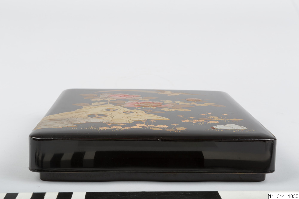 Ask med lock. Rikt dekorativt lackarbete i guld och färg med pionblommor och en frågel mot svart bakgrund.