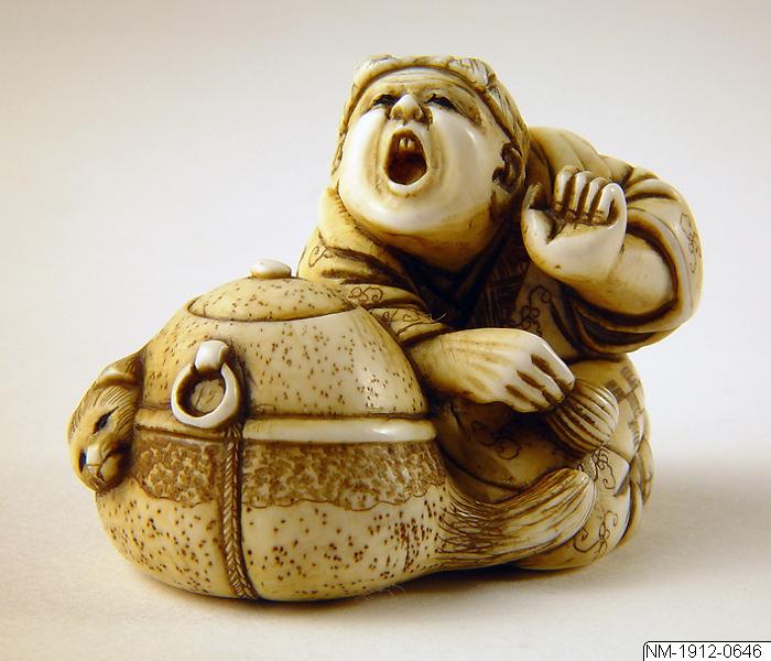 Netsuke-föremålets funktion består i att vara en motvikt till de "hängande saker" (sagemono) som bars till kimonon av männen. Vanliga hängande saker var olika dosor, till exempel medicindosor (inro) och tobakspungar. Netsuke betyder ungefär "fästa rot" och tidiga netsuke (före sent 1600-tal) var förmodligen naturliga, obearbetade rötter och liknande. Från 1700-talet gjordes de mer föreställande och ofta i trä eller elfenben. Så småningom började konstnärerna att signera sina netsuke. (Baserad på text från utställningen Japan. Föremål och bilder berättar. 2011). /PH