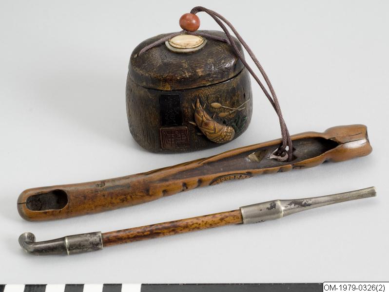 Pipfodral och tobaksask. Trä med guld, grönt och rött lack, beninlägg. Tobaksasken är dekorerad med en tai (havsruda), en ika (tioarmad bläckfisk), en awabi (havsöra) och en flundra. Motivet på baksidan är ett bambuskott. Piphållaren, av typ senryu-zutsu, är gjord av snidat trä och föreställer en bläckfisk (tako).