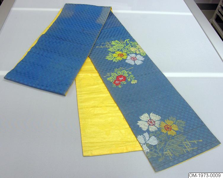 - Obi av blått siden med blomdekor i färger. 1900-tal.