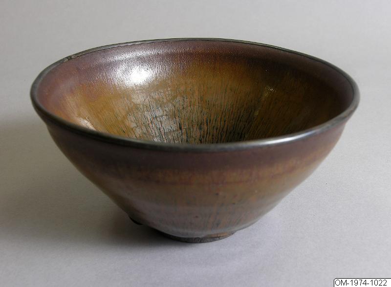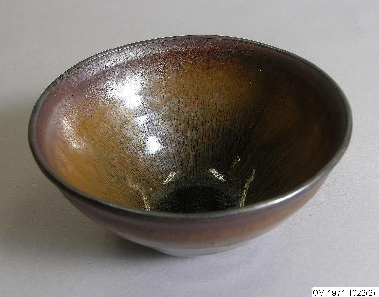 Teskål av stengods. Brun och blåstrimmig Jian-vara (Temmoku).