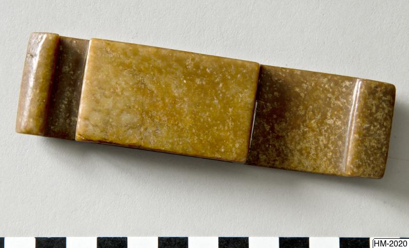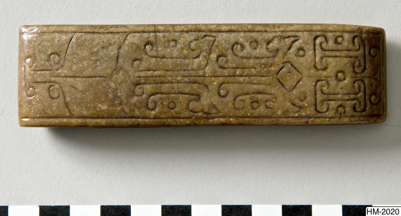 Enligt katalogkort: Svärdsbeslag med djurmasker och spiralornament på ovansida.
