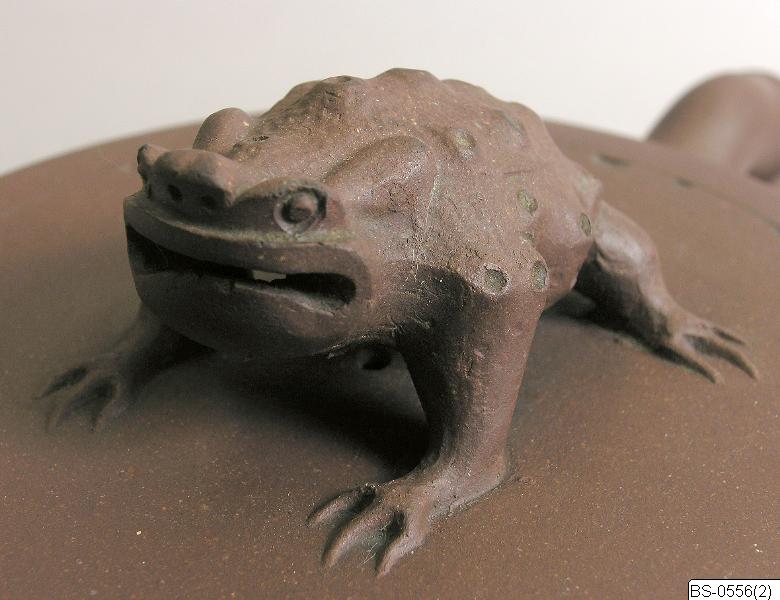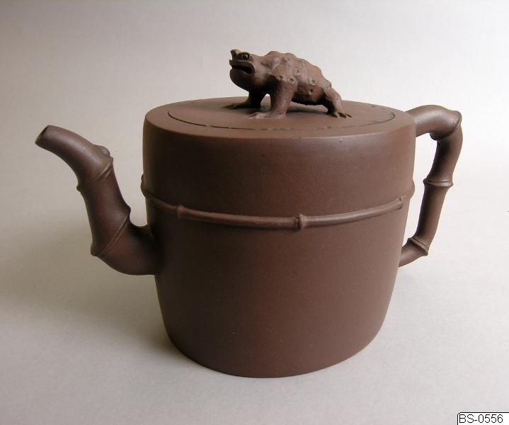 - Tekanna i rött lergods. Ovalt cylinderformad. Pip och gräppe dekorerade (som bambu?) och på toppen en groda.