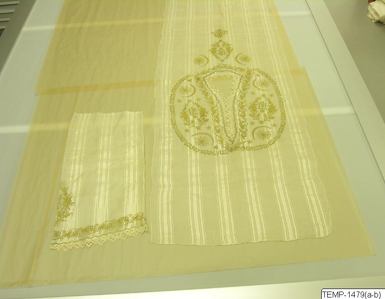 - Delar av en blus. Fram/bakstycke samt en ärm. På tunn,genomskinlig vit väv är broderat med med metalltråd.