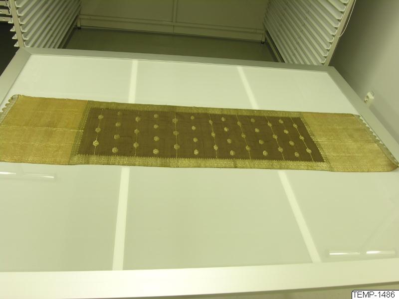 - Duk, i brunt med invävda metalltrådar och en spets i metalltråd.