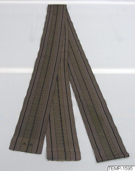 - Bälte (obi) av brunt mönstervävt tyg.