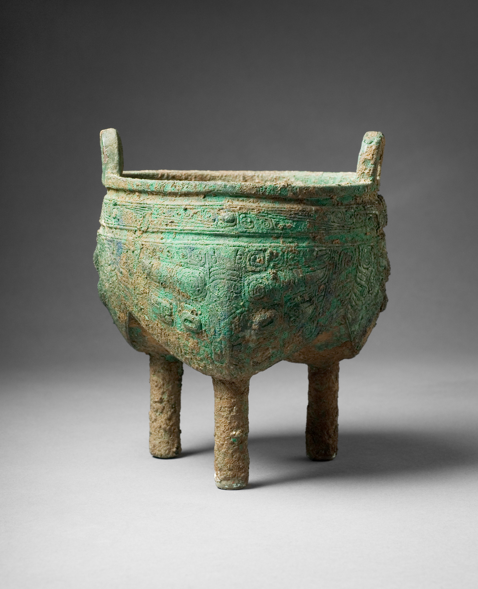 Li ding - kokkärl av brons för offerbruk. Kärl på tre cylindriska ben, med utvikt mynning och två U-formade handtag. Dekorerat med bård av cikadliknande meandermönster (xiejiao yunleiwen) under mynningen. Kroppen dekorerad med tre oxhuvudsliknande taotie-masker i kraftigt relief.