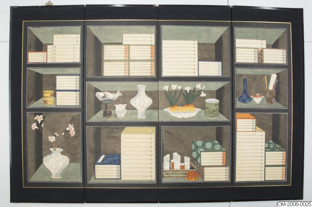 Den här vikskärmen består av fyra paneler med målningar som föreställer bokhyllor i trompe d'oeil-stil. Bokhyllorna är fyllda med staplar av böcker med färgglada, dekorativa omslag samt skrivmaterial och värdefulla samlarobjekt. De föremål som syns är bland annat kinesiska porslinsvaser, en lack(?)ask i japansk stil, konstnärligt snidade sigill i jade bredvid en rund sigilllask i lack samt en träkruka med träpenslar och en vertikalrulle. Krukan har snidade utsmyckningar (troligen efter modell av penselkrukor i noshörningshorn). På den tredje panelen från höger syns på den mittersta hyllan en statyett i form av en hoppande karp på en snidad träställning. Karpen symboliserar att en person, efter avklarad statlig tjänstemannaexamen, fått tjänst inom den statliga administrationen. I det nedre vänstra hörnet syns några grenar med azaleablommor i en vit porslinsvas och i den andra panelen från höger syns narcisser i en vit flikformig porslinsskål. Tekniker som skuggning och perspektivmålning har använts för att skapa en känsla av djup i bilden och bidrar i stor utsträckning till att bokhyllan ser så verklighetstrogen ut. Stilleben där motivet utgörs av böcker och andra föremål som fanns i lärda mäns arbetsrum kallas för Chaekgeorido- eller Chaekgadomålning. De första chaekgeoridomålningarna i Korea målades vid kung Jeongjos hov (r. 1776-1800) under det sena 1700-talet. I dessa målningar avbildades stora bokhyllor som var nästan helt och hållet fyllda med böcker, för att inspirera till akademiska studier och kunskapssträvan i samhället. Snart blev chaekgeorimålningar populära även utanför hovet och de spreds under 1800-talet vidare till andra samhällsklasser. Det fanns ett stort intresse hos de förmögna över- och medelklasserna för antikviteter och dekorativa skrivutensiler och de uppskattade att få dem avbildade i chaekgeoridomålningar.
