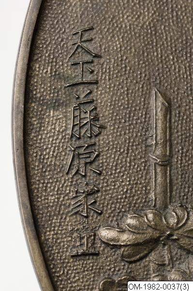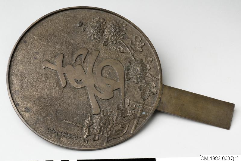 Dekor i lagd relief på spegelns baksida: tecknet för långt liv (kotobuki), spaljé med krysantemum.