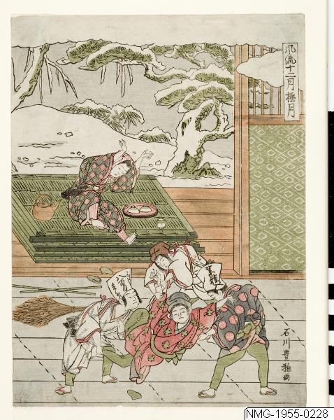 - Träsnitt av Ishikawa Toyomasa med motiv: storrengöring. (Enligt Publicerat Susuhaki ur Furyu juni getsu, Refined views of the 12 months). Ca 1767.