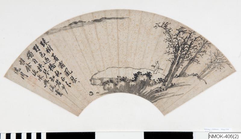 Solfjädersmålning i tusch med färger på guldstänkt bakgrund, som förnyats på ett par ställen.