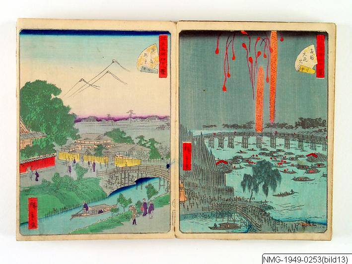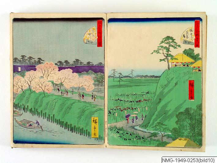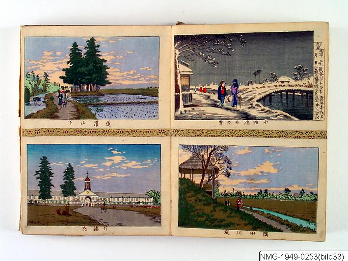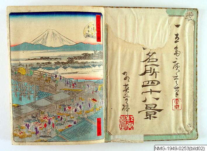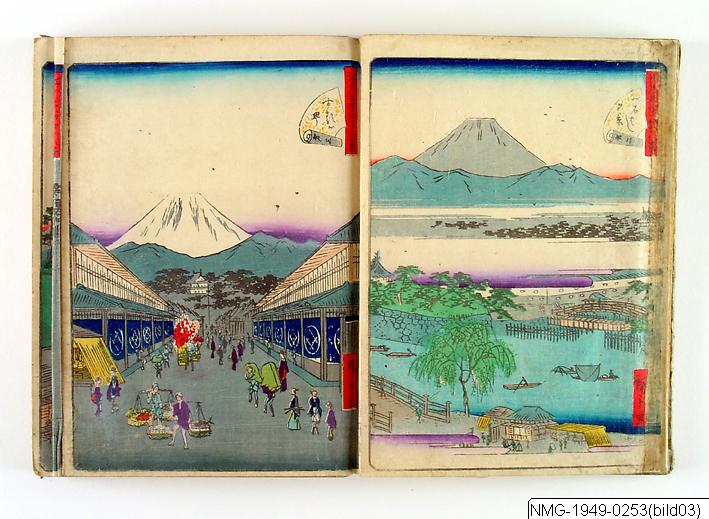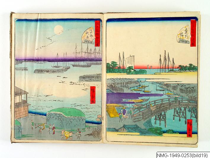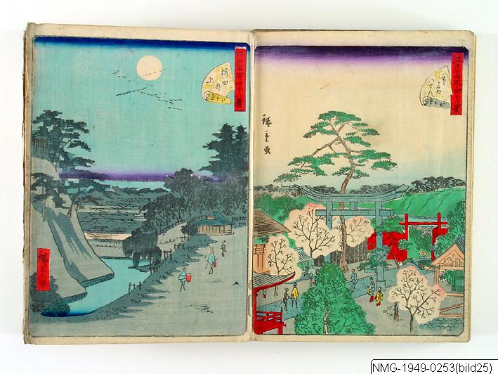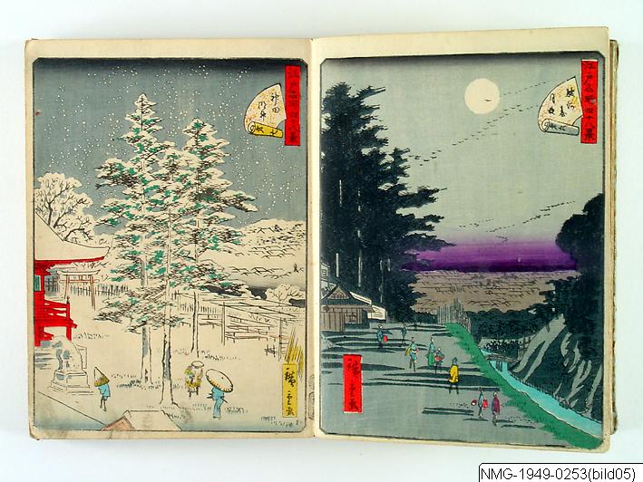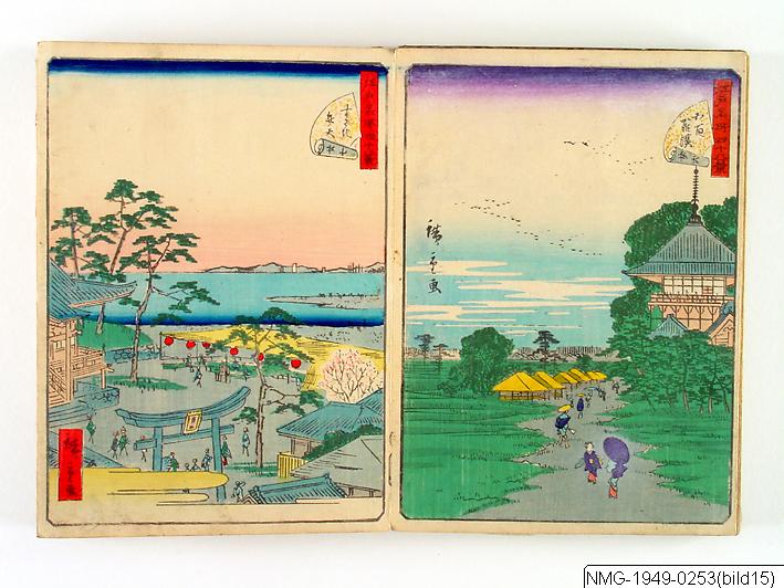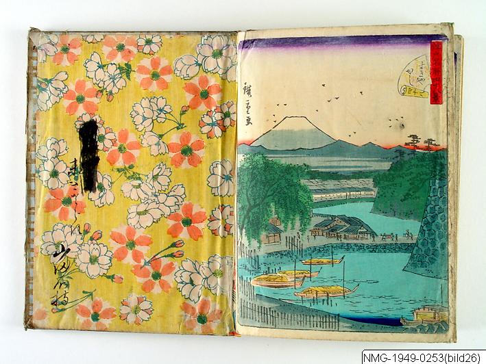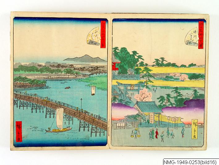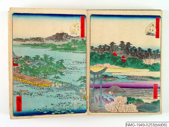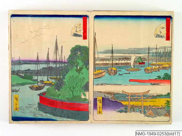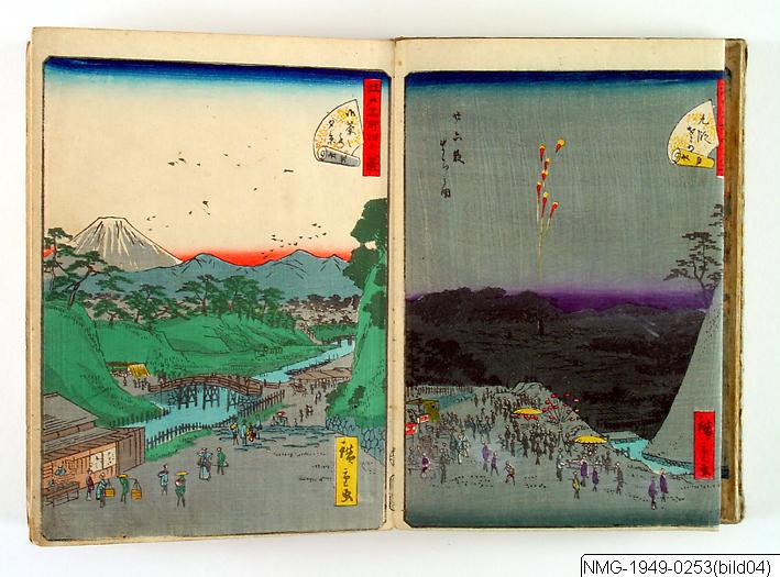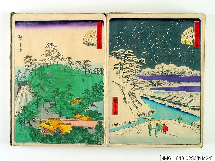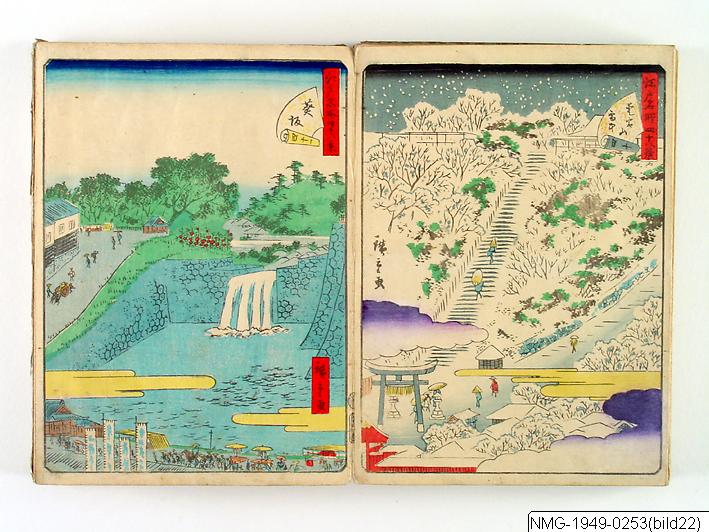 Träsnittsbok av Utagawa Hiroshige II. Ett album med landskapsbilder, 48 sidor ihopmonterade. Edo Meisho 48-kei. 1861.