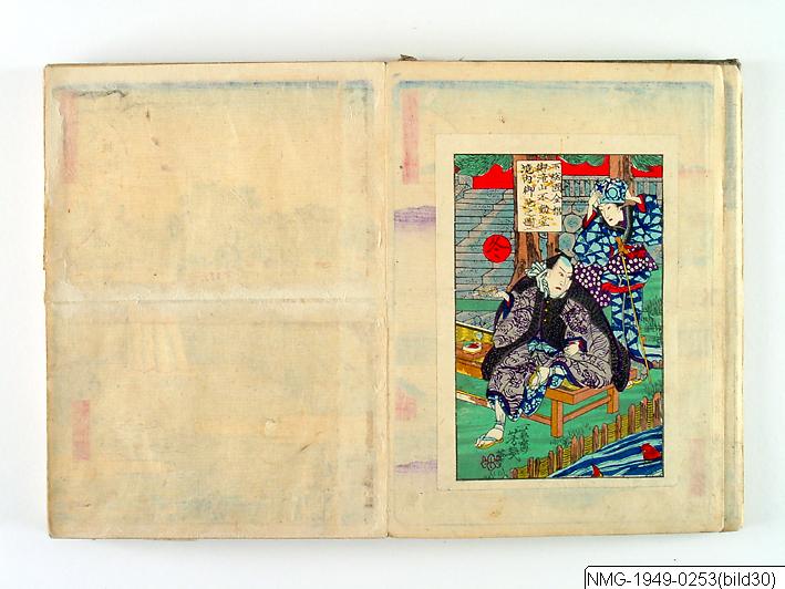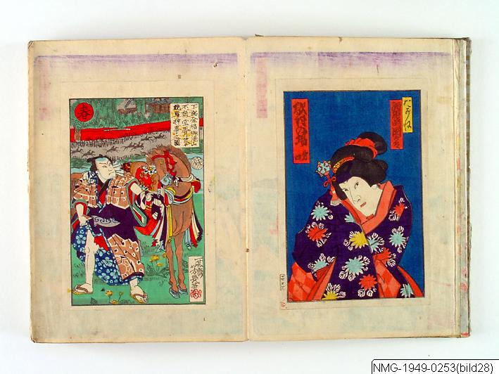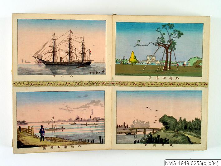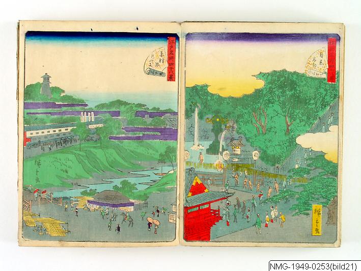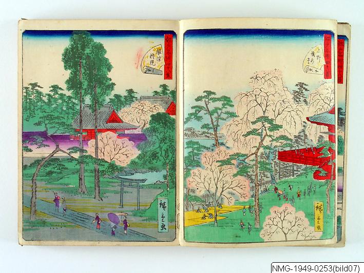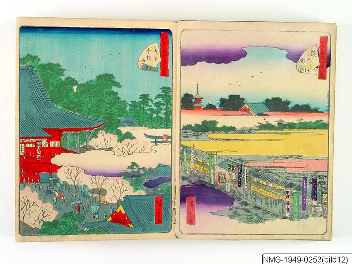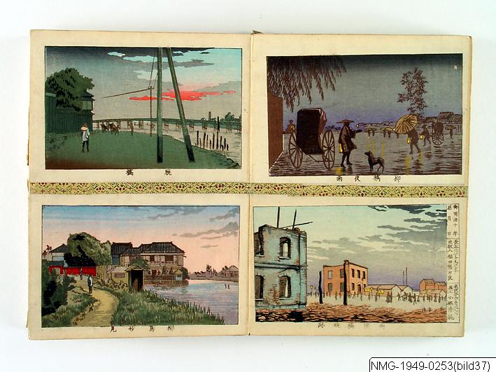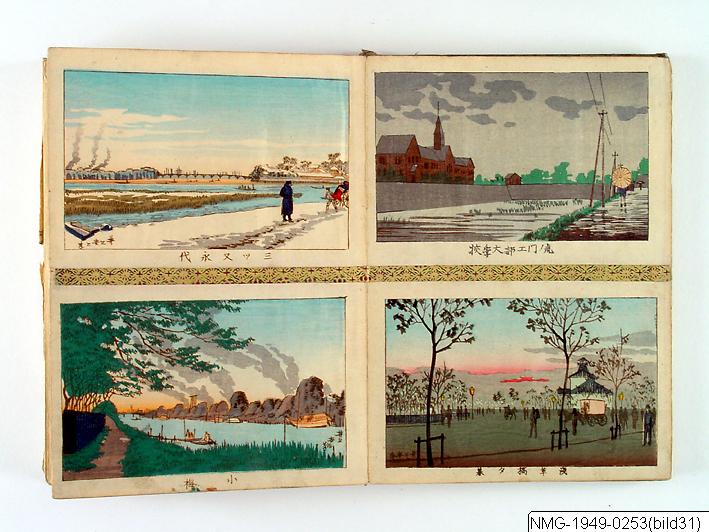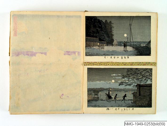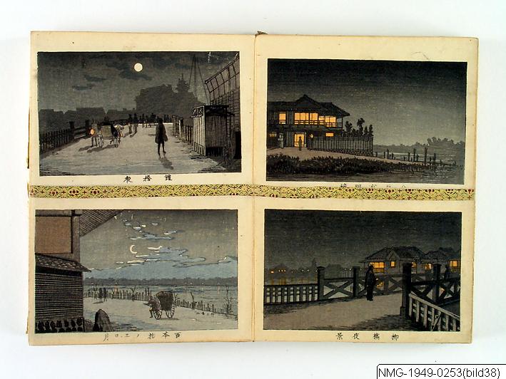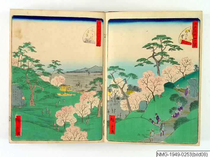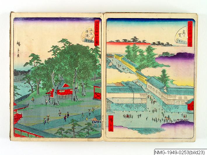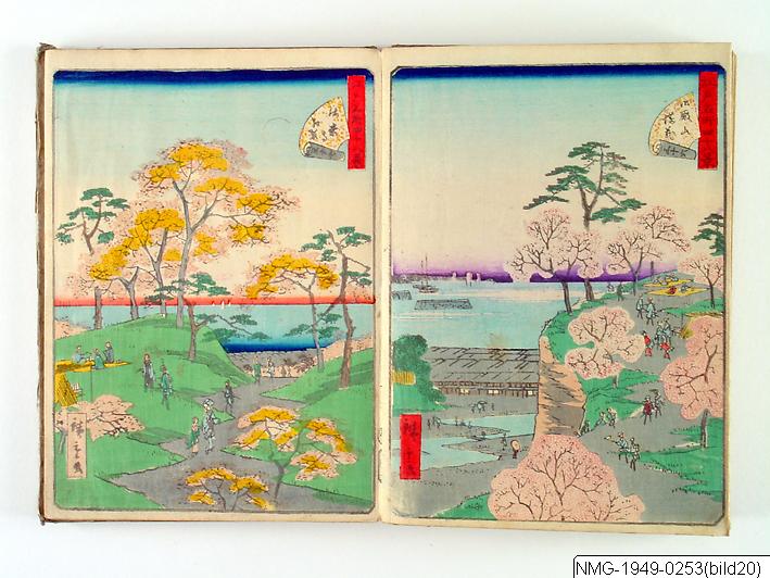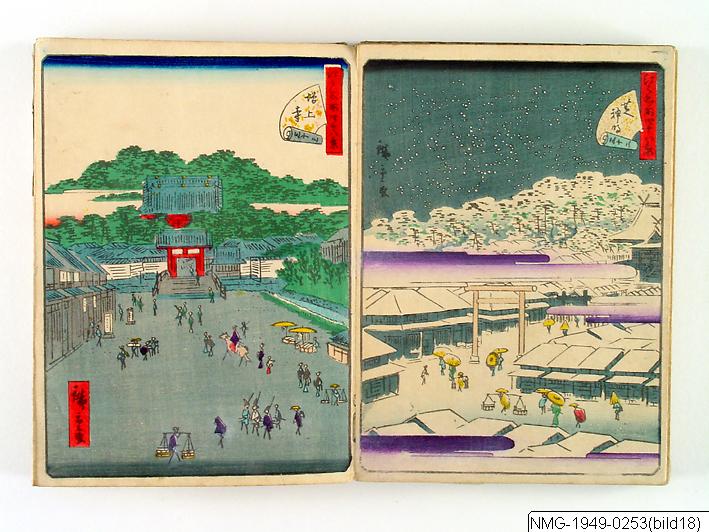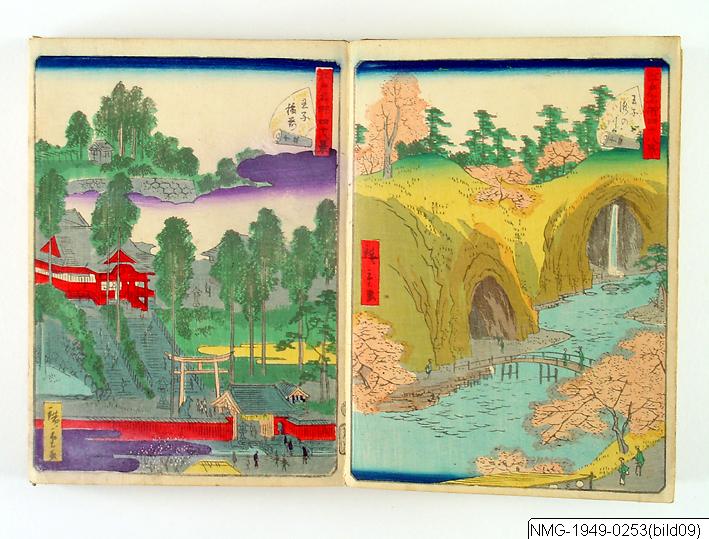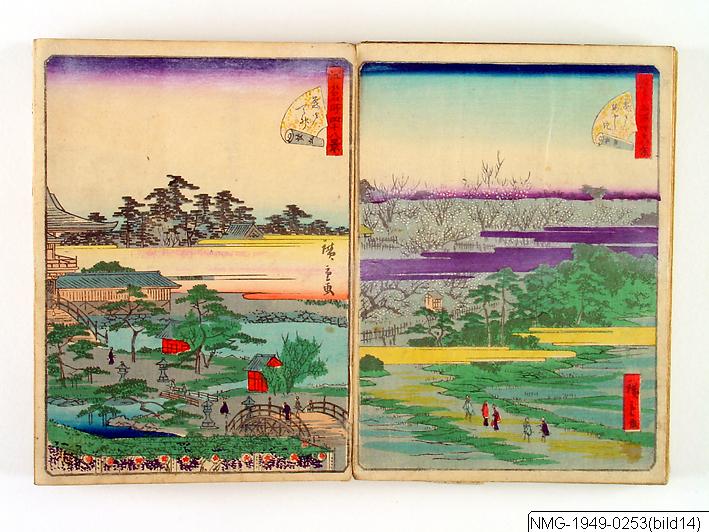 Träsnittsbok av Utagawa Hiroshige II. Ett album med landskapsbilder, 48 sidor ihopmonterade. Edo Meisho 48-kei. 1861.