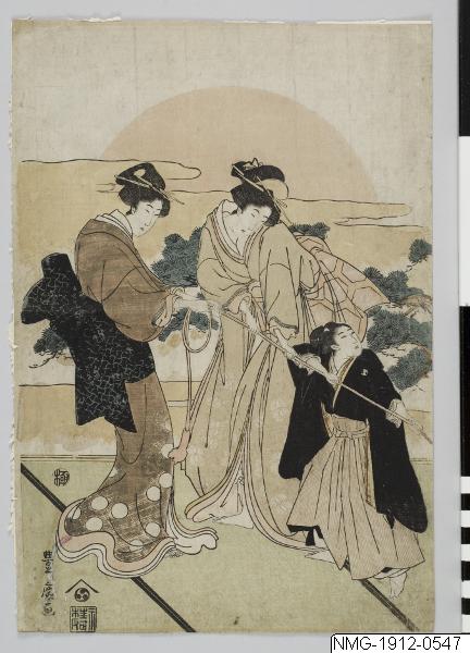 Två kvinnor och en pojke som drar i ett rep till en blomstervagn på nyårsdagen. Tidigt 1800-tal.