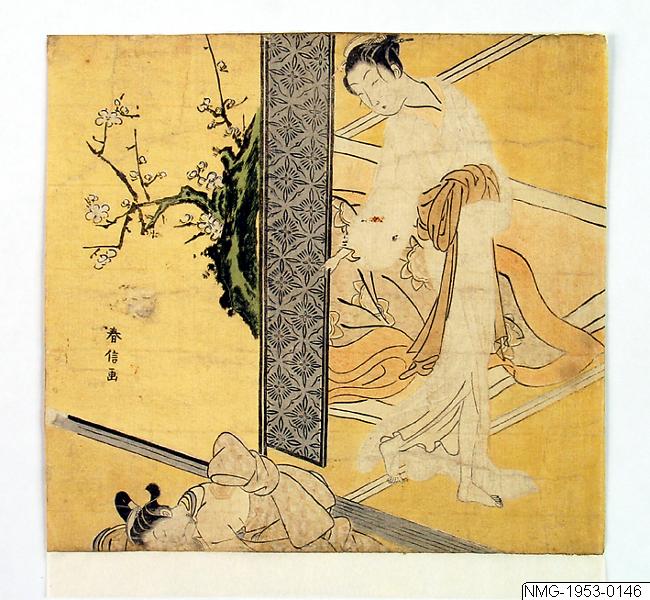 - En kvinna går förbi tittandes mot en annan kvinna som ligger på golvet. Träsnitt av Suzuki Harunobu. Kurtisan som just har gått upp ur sängen kommer på sin tjänsteflicka med att sova. 1765-1770.